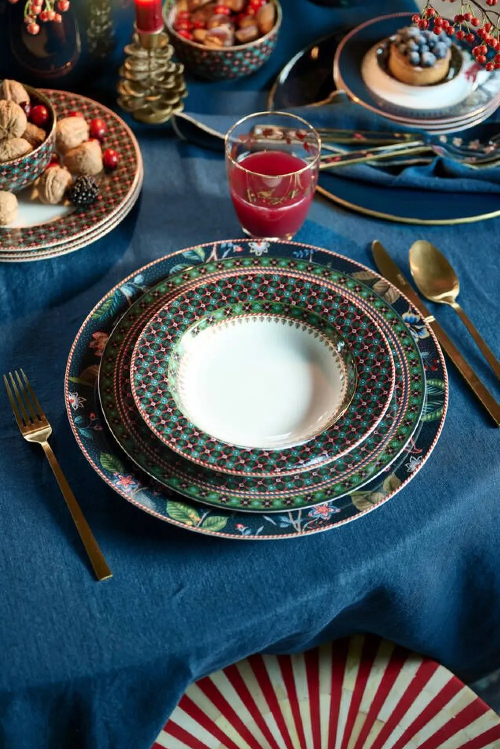 | Pip odottaa jo salaa pitkiä talvi-iltoja. Tällaisina iltoina hän kutsuu perheensä ja ystävänsä mukavaan illalliseen. Tätä varten Pip suunnitteli Berry Blues -kokoelman. Kokoelman esineissä on tummansininen kukkakuviointi, jossa oksilla kasvaa elegantteja fantasiakukkia ja marjoja. Kokoelman sisällä kukkakuviointi yhdistetään syvän vihreään laattakuvioon punaisin koristein, muistuttaen tunnetuista talvikuoseista. Reunat on viimeistelty kultaisin koristein ja yllättävällä punaisella ja valkoisella raidalla, jotka antavat kokoelmalle extra lämpimän ja kodikkaan tunnelman. Uskallamme väittää, että Berry Blues -kokoelmamme on paras lääke talvivaivoihin. Tämä tuote ei sovellu astianpesukoneeseen, uuniin tai mikroaaltouuniin. |