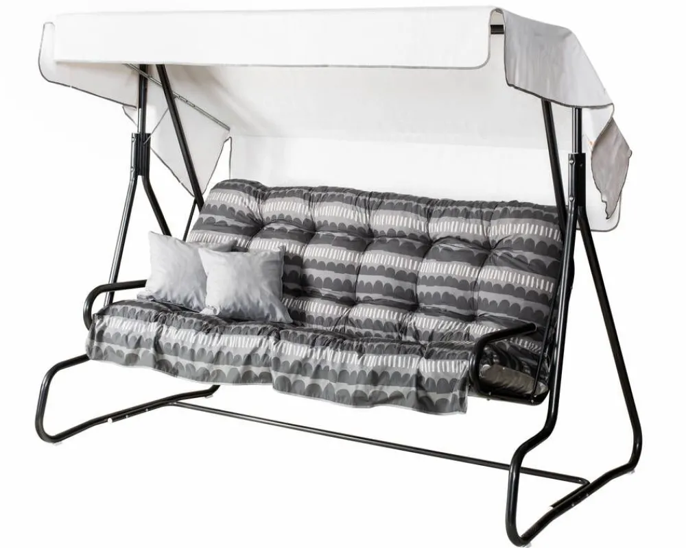 | Hoito-ohjeet:Keinun voi puhdistaa pyyhkimällä kostealla liinalla ja käyttää tarvittaessa mietoa pesuainetta. Suosittelemme, että pehmusteet nostetaan sateella suojaan ja katos otetaan pois rankkasateiden ja kovien tuulien ajaksi. |