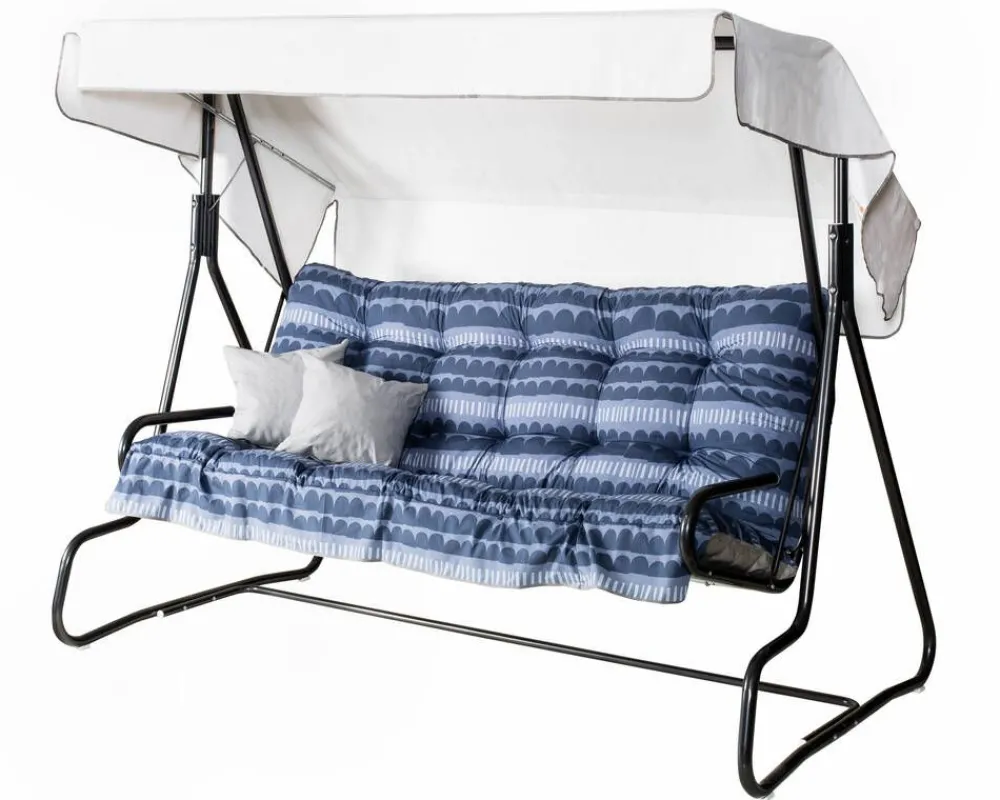 | Hoito-ohjeet:Keinun voi puhdistaa pyyhkimällä kostealla liinalla ja käyttää tarvittaessa mietoa pesuainetta. Suosittelemme, että pehmusteet nostetaan sateella suojaan ja katos otetaan pois rankkasateiden ja kovien tuulien ajaksi. |
