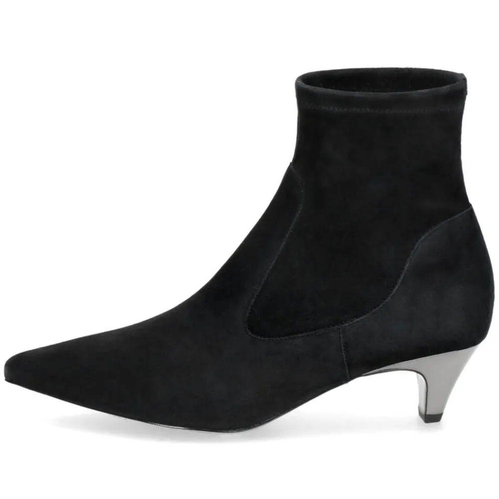 Upea joustava mokkanahkainen nilkkuri, jossa on hohtava hopeinen 45mm korko ja terävä kärki.Lisää tietojaVuorin mat…