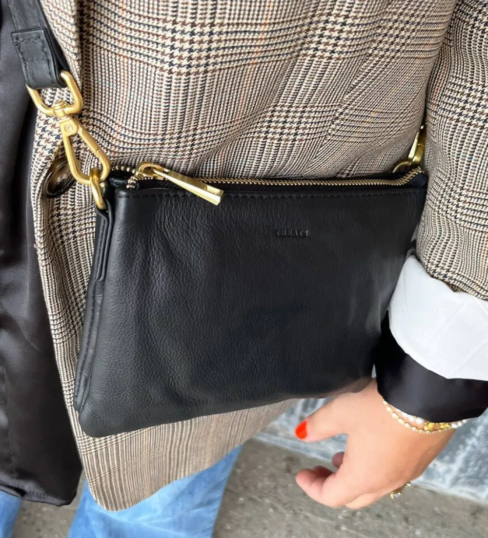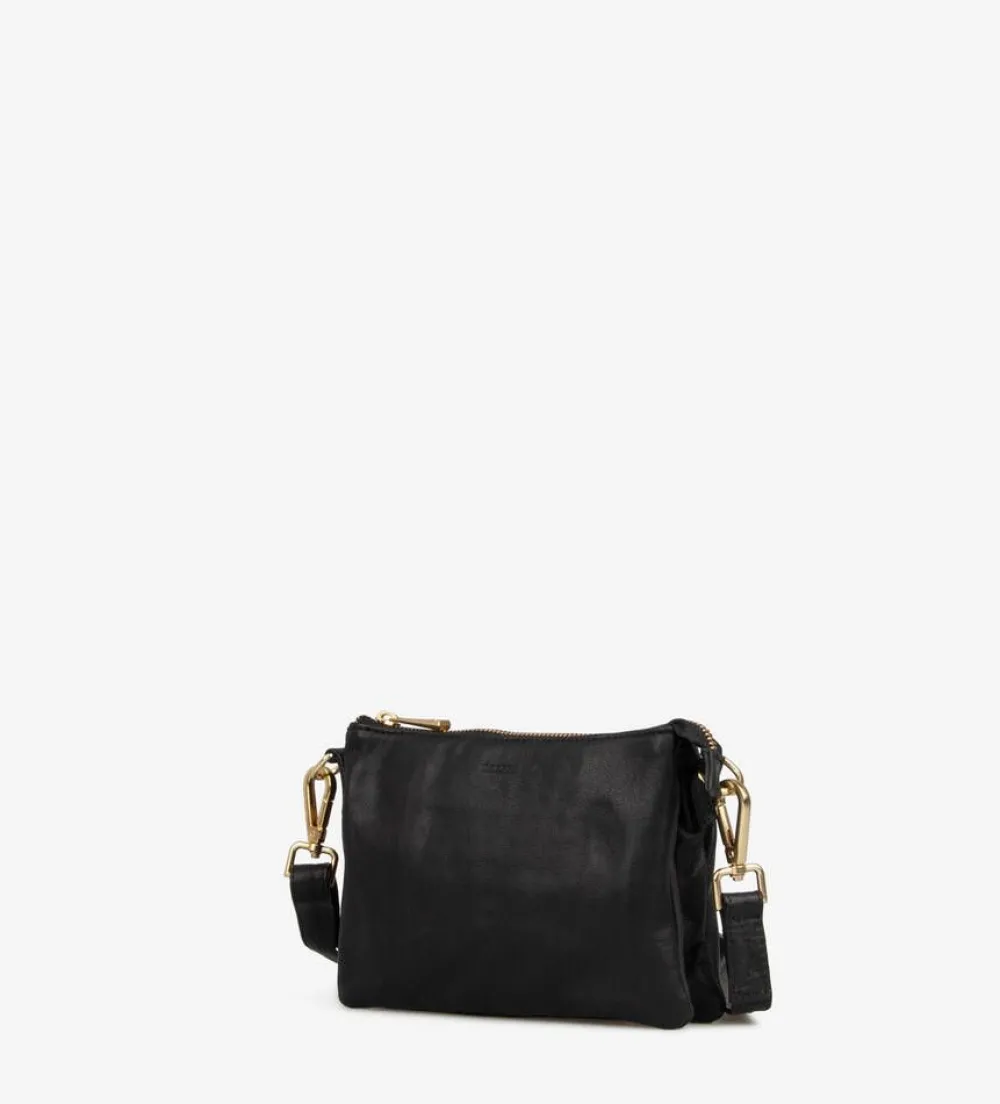 Pehmeästä lehmännahasta valmisetettu monikäyttöinen musta olkalaukku kultaisilla metalliyksityiskodilla. Laukussa o…