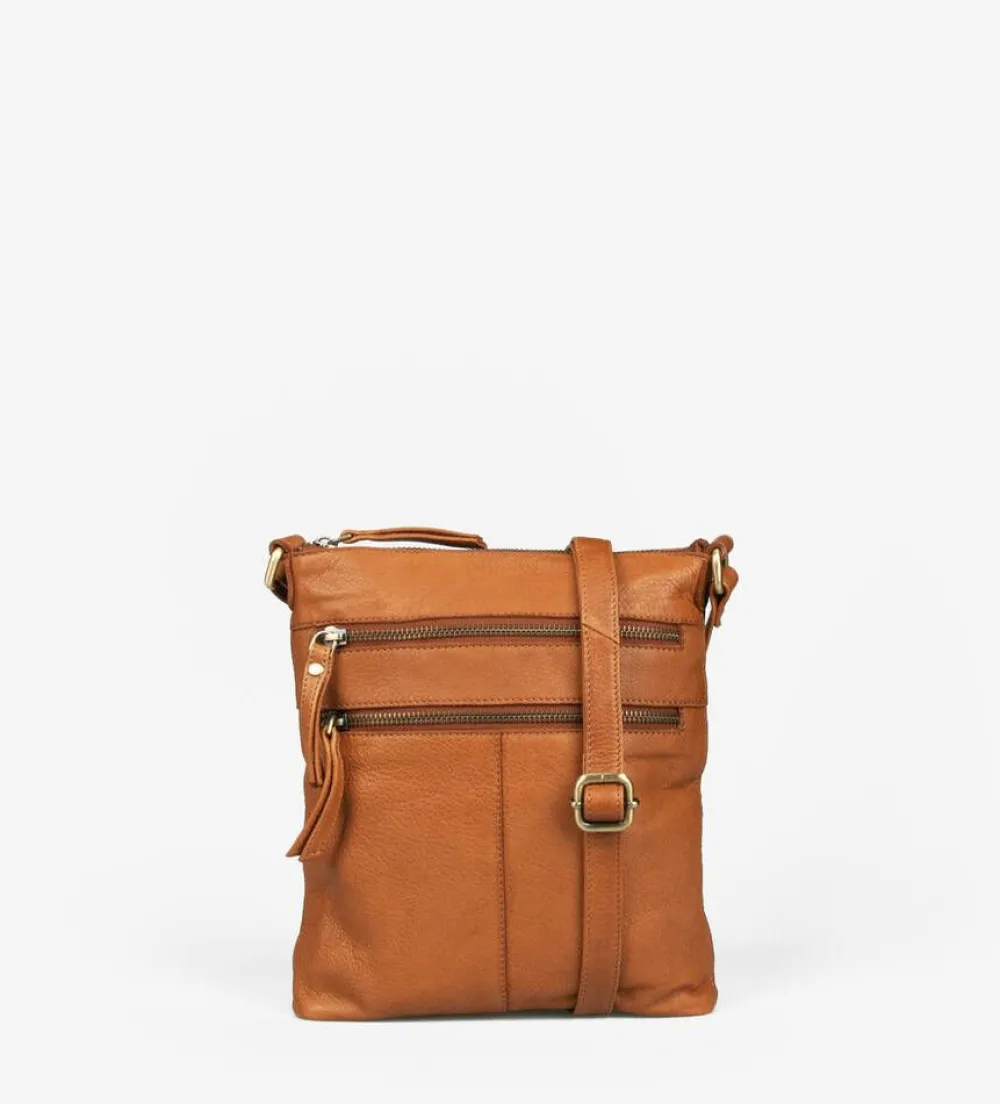 Nahkainen olkalaukku, jossa on säädettävä olkahihna ja kaksi vetoketjutaskua edessä. Laukussa on vetoketjukiinnitys…