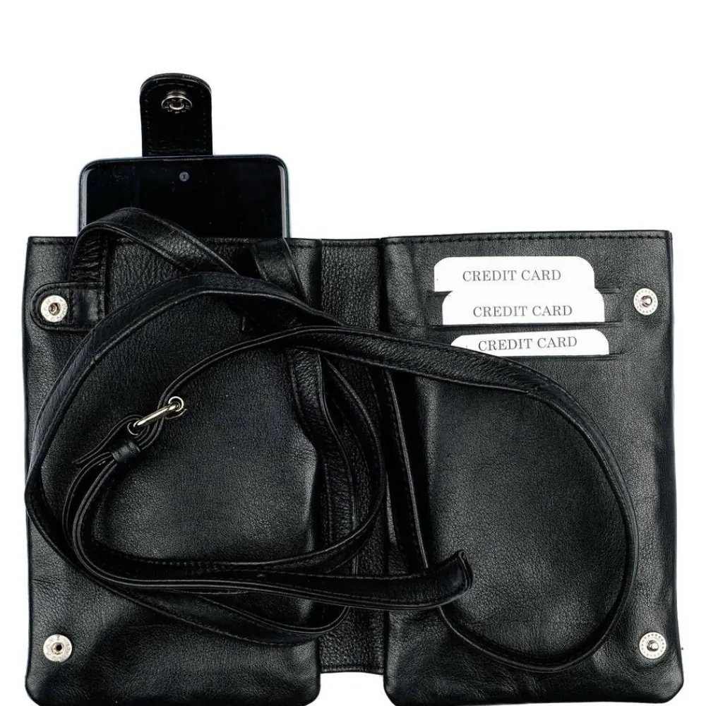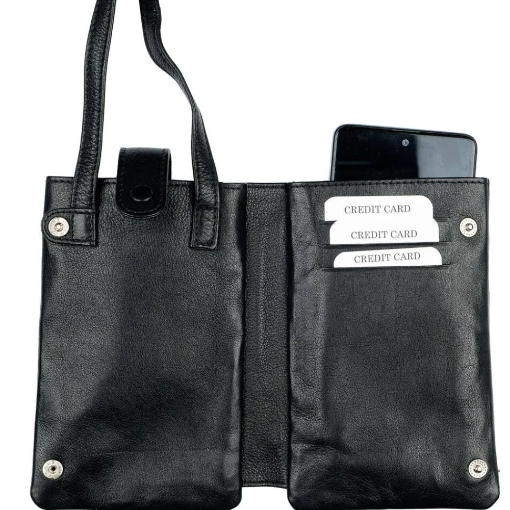 Tyylikäs ja kätevä pieni nahkalaukku puhelimelle tai jopa kahdelle. Vaihtoehtoisesti toiseen syvään taskuun aurinko…