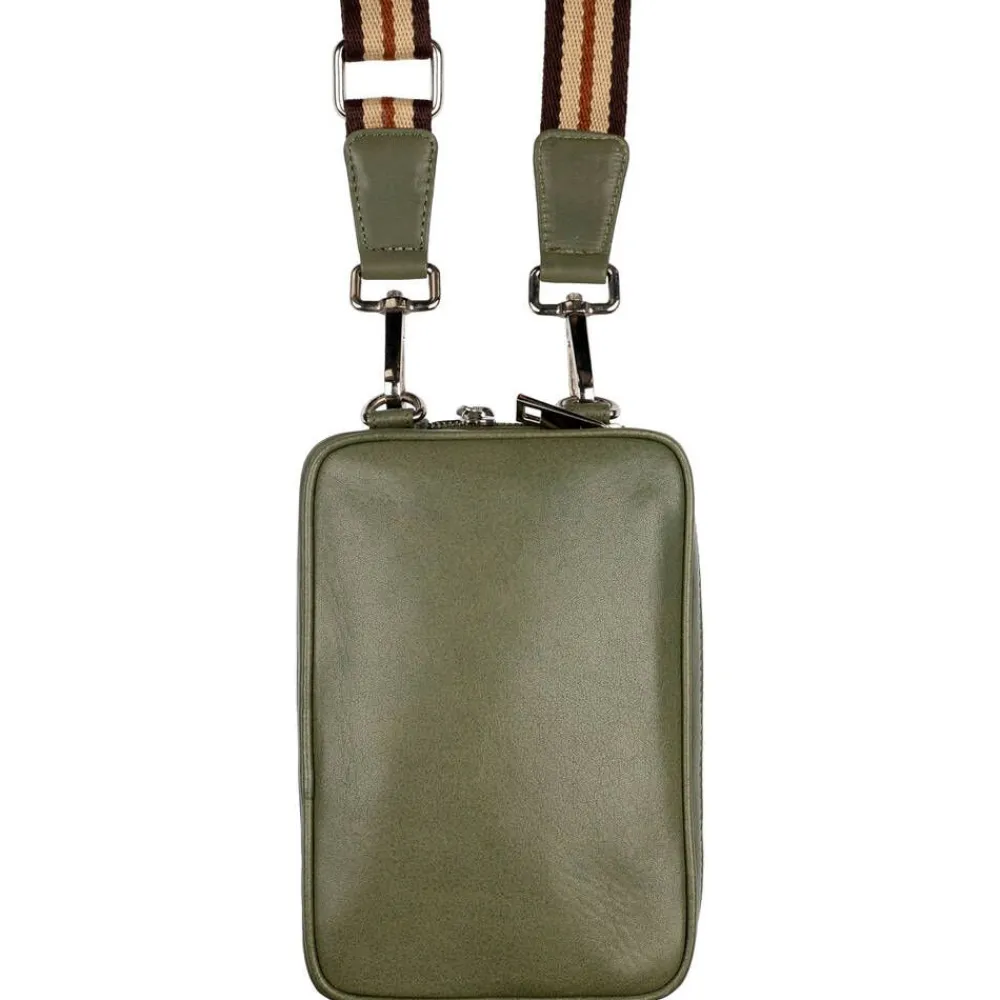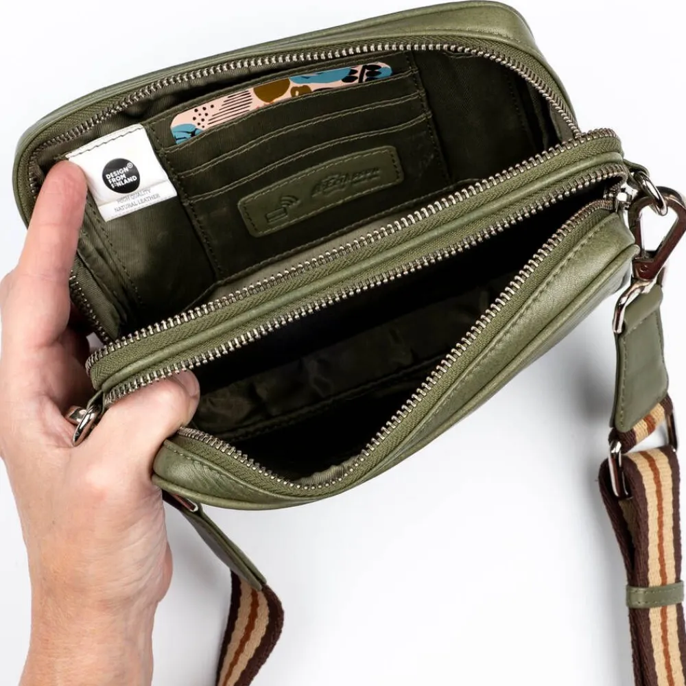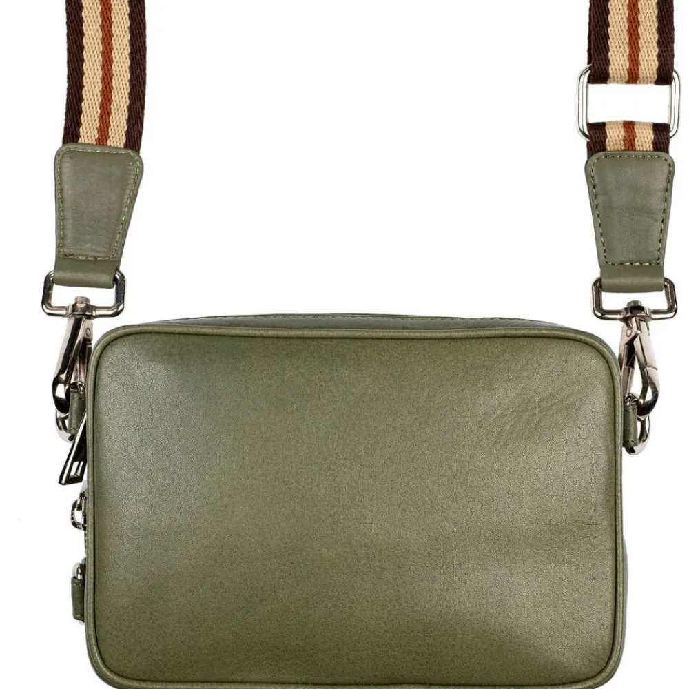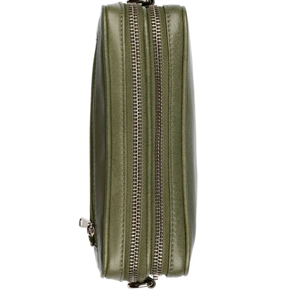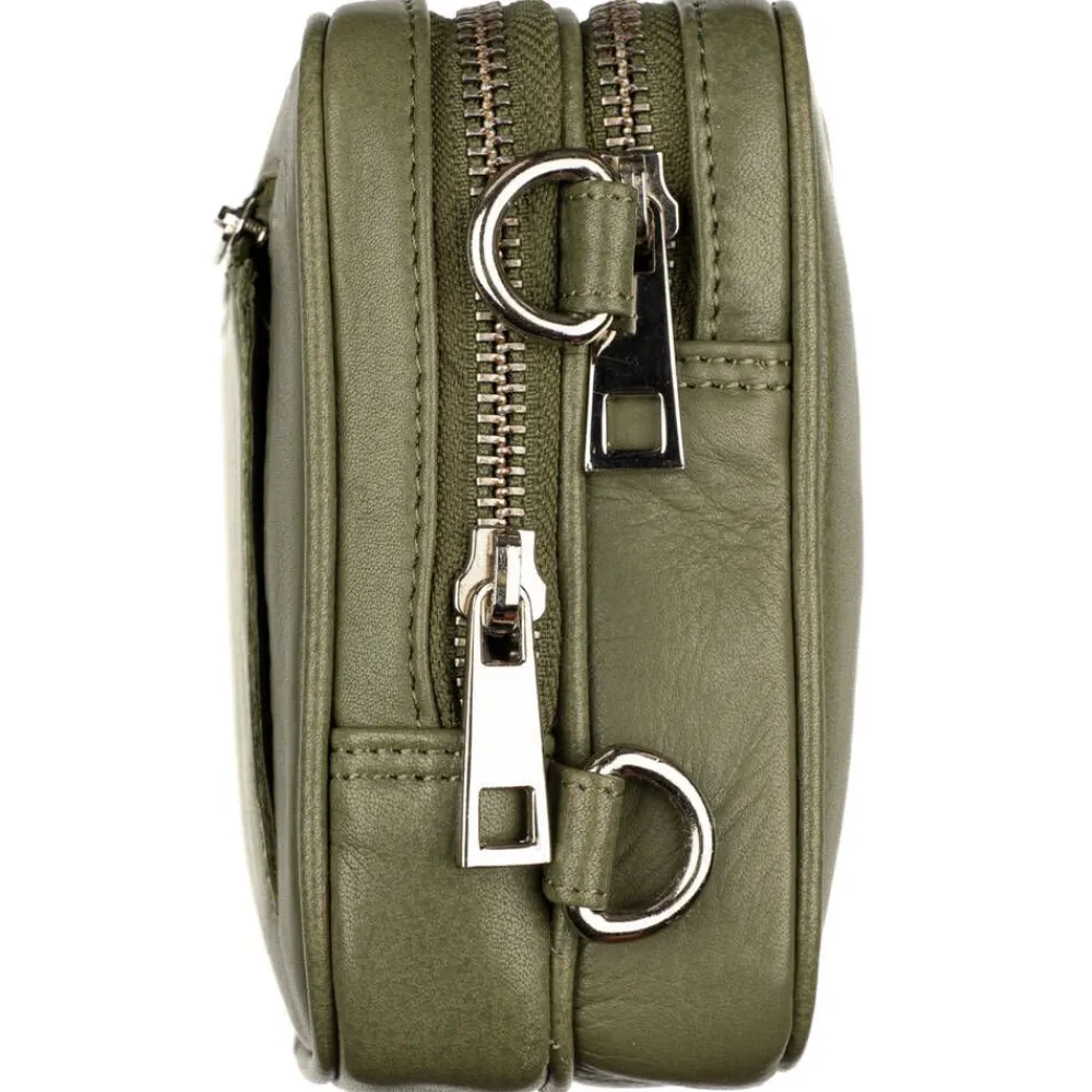 Monikäyttöinen pintanahkainen olkalaukku oliivinvihreässä sävyssä. Laukussa on kaksi vetoketjullista taskua sekä …