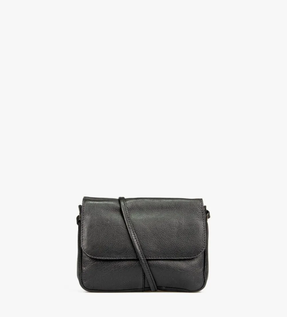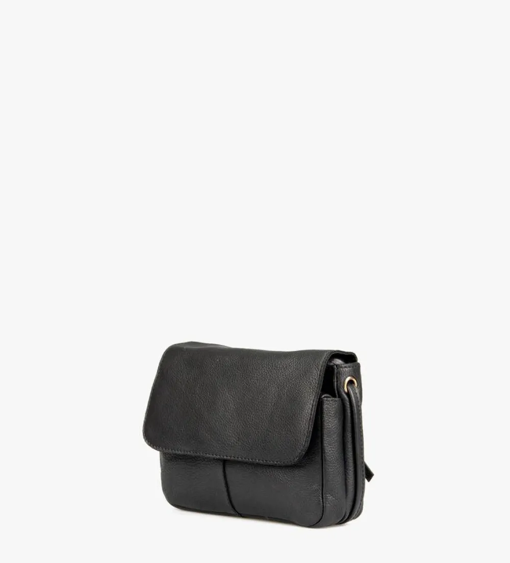 Musta ja ajaton olkalaukku läpällä ja säädettävällä olkahihnalla.Lisää tietojaKiinnitys: Vetoketju/magneettiMa…