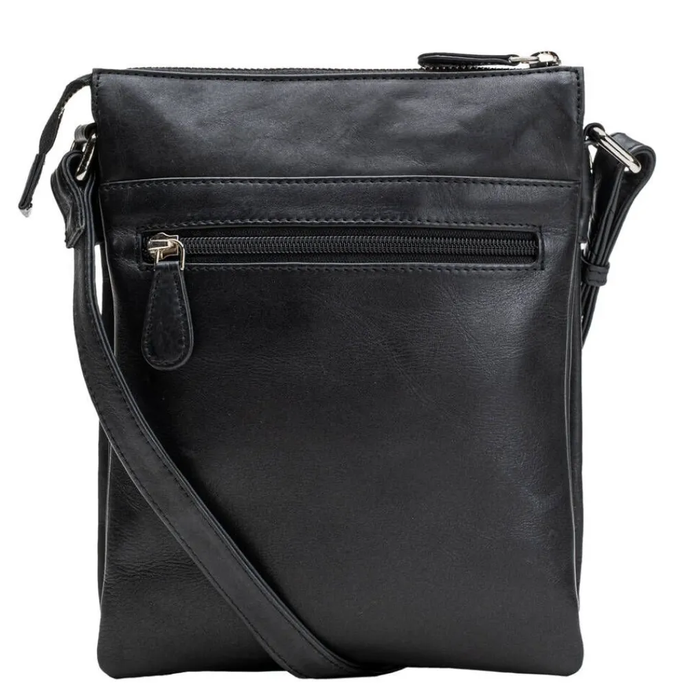 Pystysuuntainen nahkalaukku useilla taskuilla. Etupuolella magneettikiinnitteinen läppätasku ja takapuolella vetoketju…