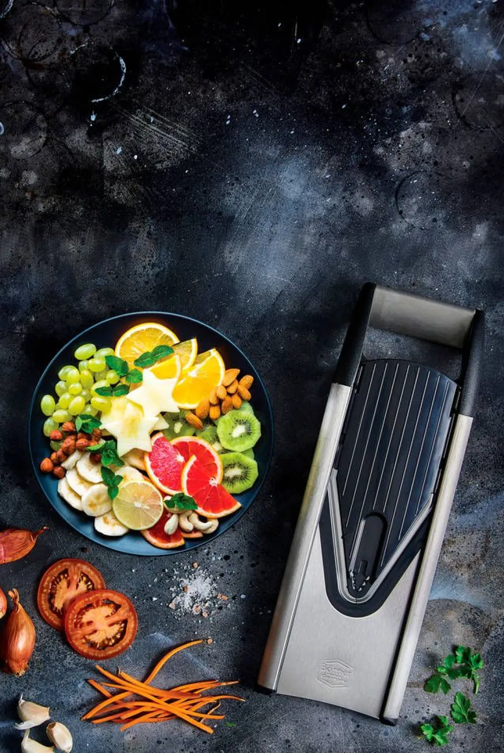 | Hoito-ohjeet:Astianpesukoneessa terät saattavat tylsyä nopeammin, joten suosittelemme käsinpesua. Huuhtele mandoliini heti käytön jälkeen. Käytä tarvittaessa astianpesuainetta ja tiskiharjaa, mutta varo tylsyttämästä terää tiskiharjalla. |