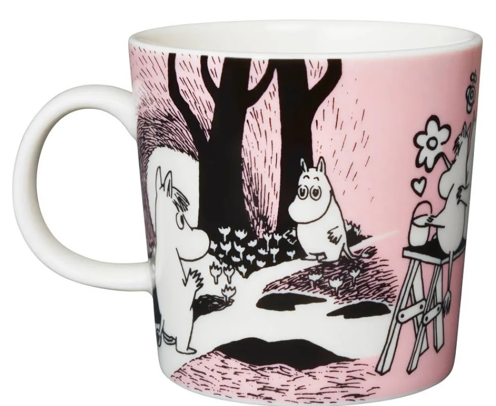 | Muumien 75-vuotisjuhlavuoden kunniaksi Arabia toi myyntiin erikoiserän juhlavuoden leimalla varustettuja klassikkomukeja. Leima on kullanvärinen, siinä lukee Moomin 75 ja sitä kuvittavat lämpimästi toisiaan halaavat Muumipappa, Muumimamma ja Muumipeikko. |