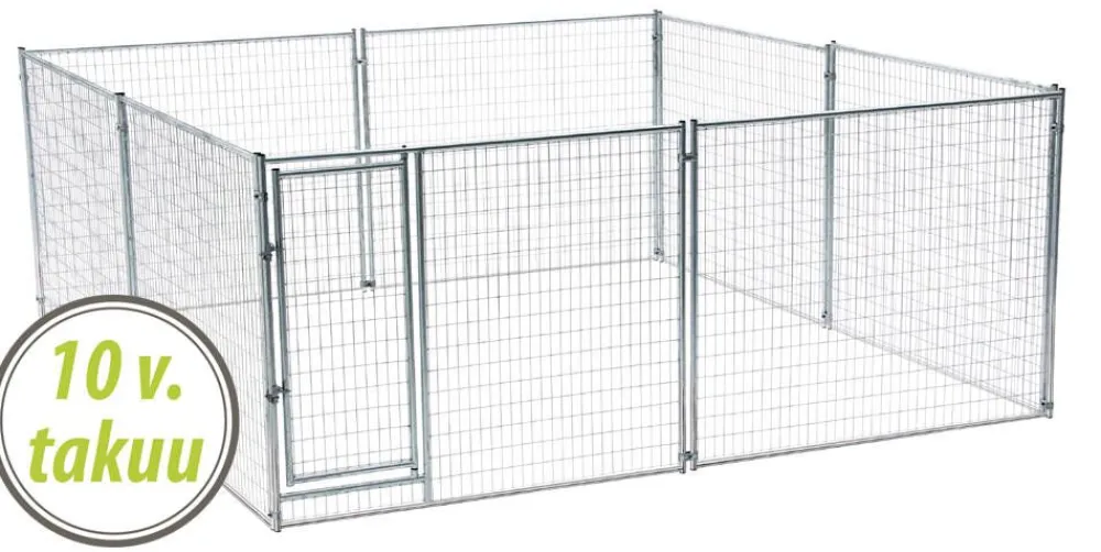 | Materiaali on kuumasinkittyä terästä. Verkon silmäkoko 50×100 mm ja materiaalivahvuus markkinoiden vahvin 4 mm, mikä pitää verkon jämäkkänä. Ohuempi verkkolanka voi aiheuttaa verkon venymisen ja löystymisen koiran esimerkiksi hyppiessä sitä vasten. Elementtien jokainen lanka on kiinnitetty hitsaamalla kehään – poikkeaa siis markkinoilla olevista ruuvatuista tai niitatuista elementtimalleista. Elementin kehä on halkaisijaltaan 32 mm pyöröputkea, minkä ansiosta tarhan muoto ei rajoitu pelkästään neliön muotoon vaan voit rakentaa minkä muotoisen tarhan tahansa! Elementtien kiinnitys toisiinsa on erittäin helppoa, tarvitset vain yhtä työkalua: 1 kpl 13 mm kiintolenkkiavainta tai räikkäavainta. |