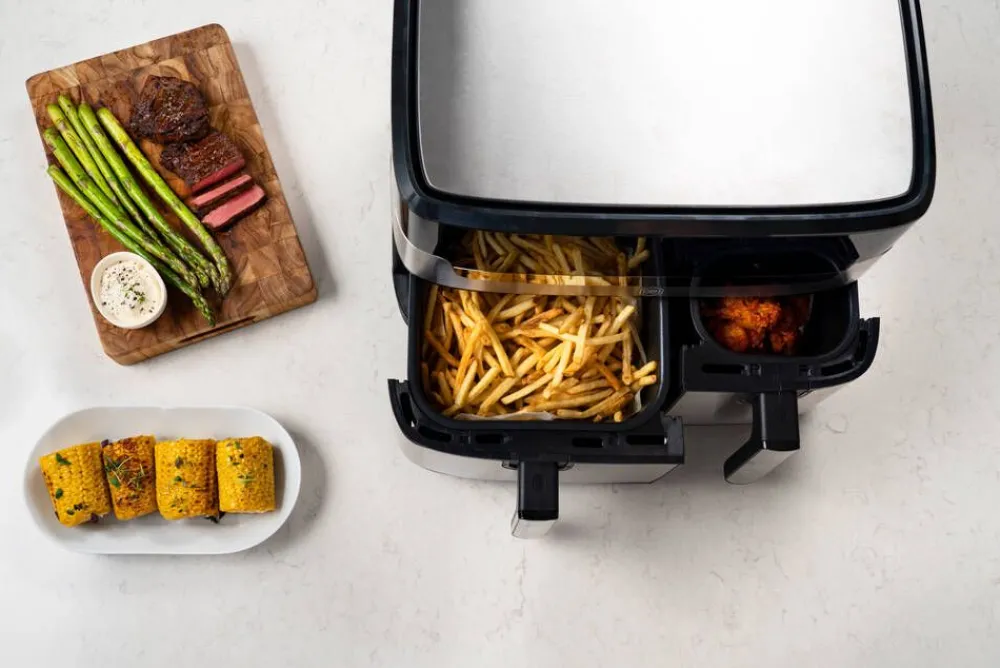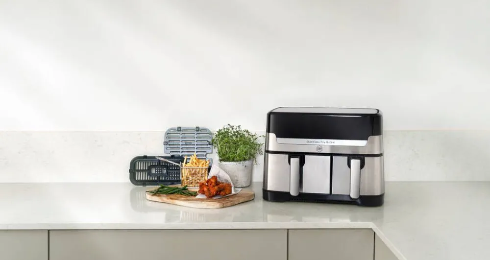 | Dual Easy Fry & Grill -keittimen mukana toimitetaan tarttumattomaksi pinnoitettu ja erittäin vankkatekoinen grillausparila, joka sopii suureen kypsennysastiaan. Mukana on myös pienempään kypsennysastiaan sopiva tavallinen ritilä, opas ilmafriteerauskeittimen käytön aloittamiseen ja käyttöopas. |