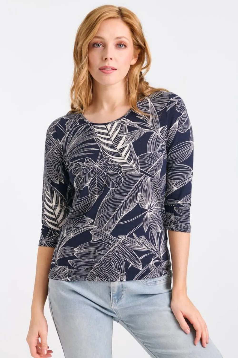 Lehtikuosinen joustava trikoopaita pyöreällä pääntiellä ja 3/4-hihoilla.Lisää tietojaMalli käyttää kokoa SMal…