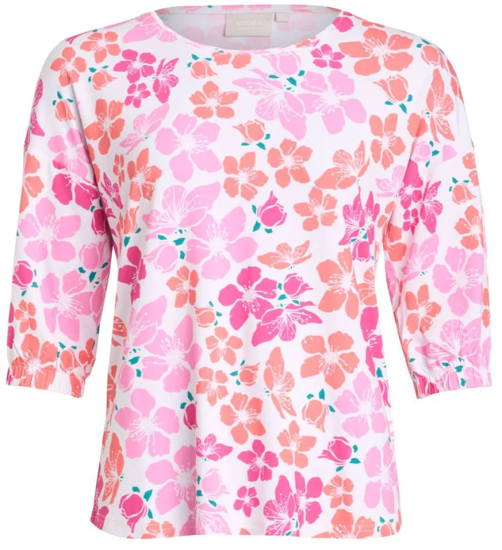 Kukkakuosinen trikoopaita pyöristetyllä helmalla ja vajaamittaisilla hihoilla. Hihansuissa on joustavat kuminauhat, jo…