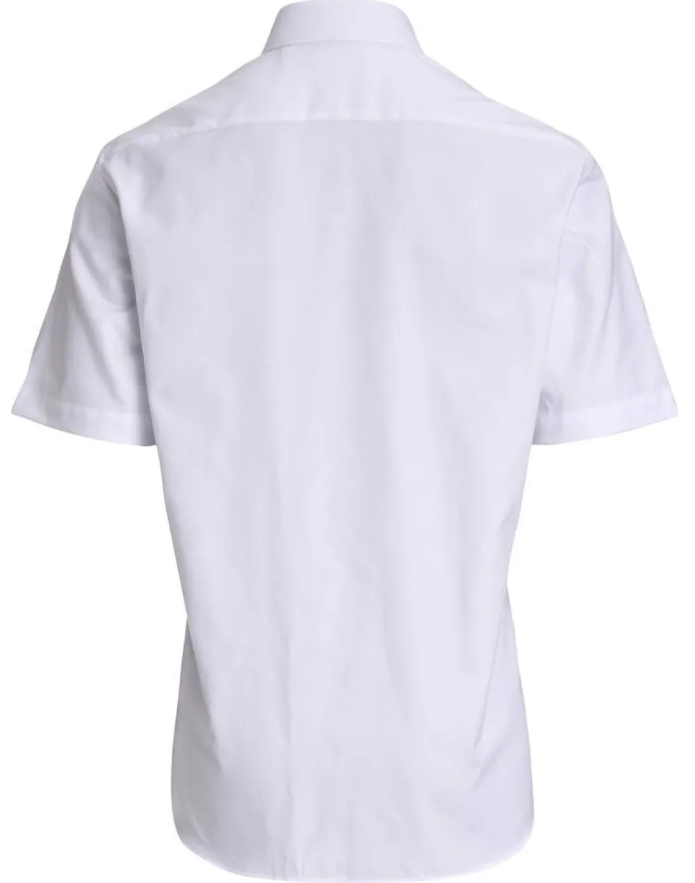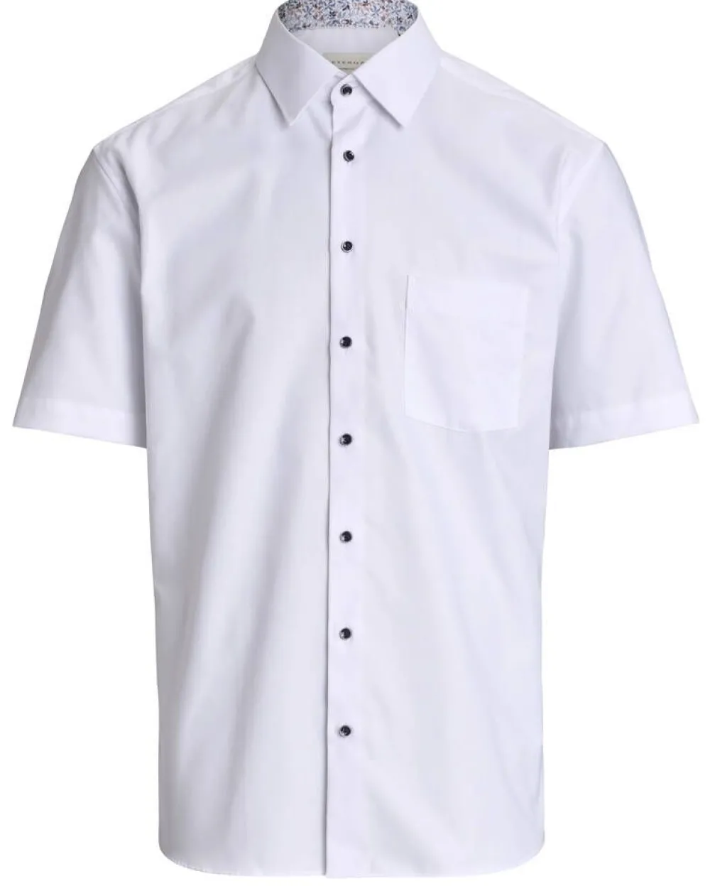 Valkoinen struktuuripintainen lyhythihainen kauluspaita tummansinisillä napeilla ja yhdellä avoimella rintataskulla.Li…