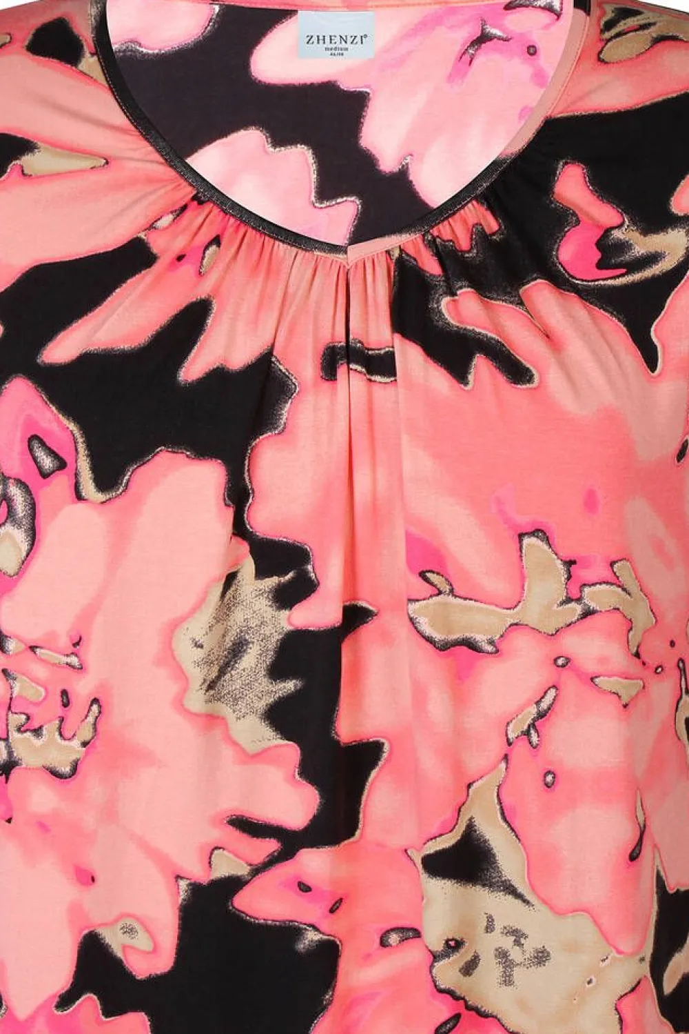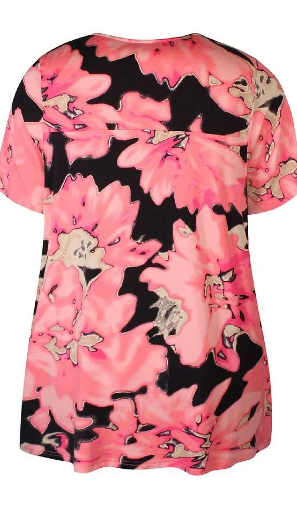 Kesäinen lyhythihainen trikoopaita pirteän keltaisella isolla kukkakuosilla. Paidassa on naisellinen rypytetty v-pää…