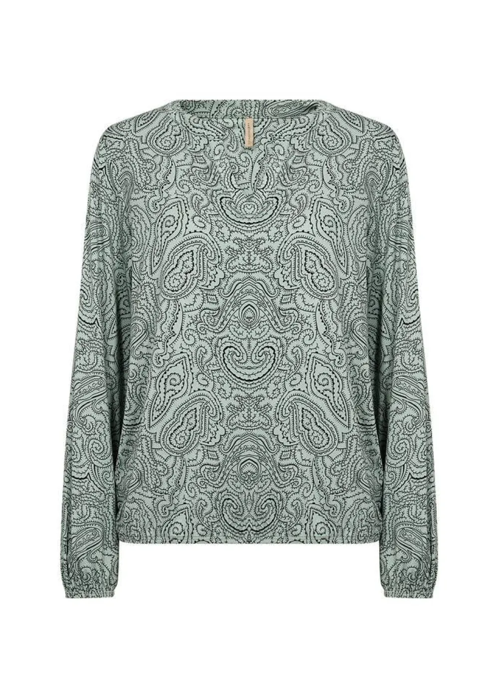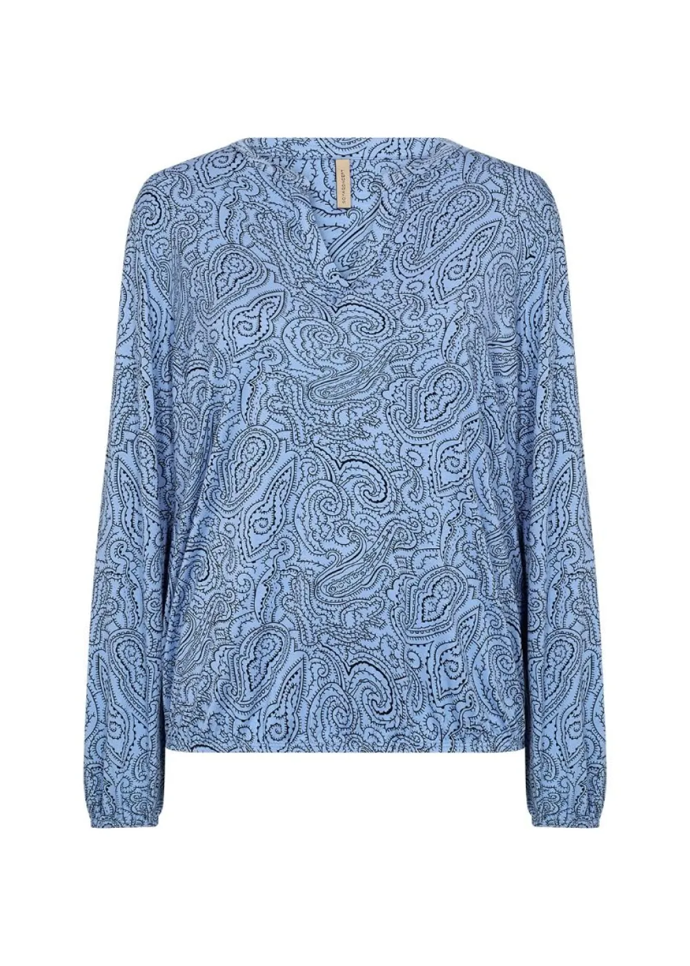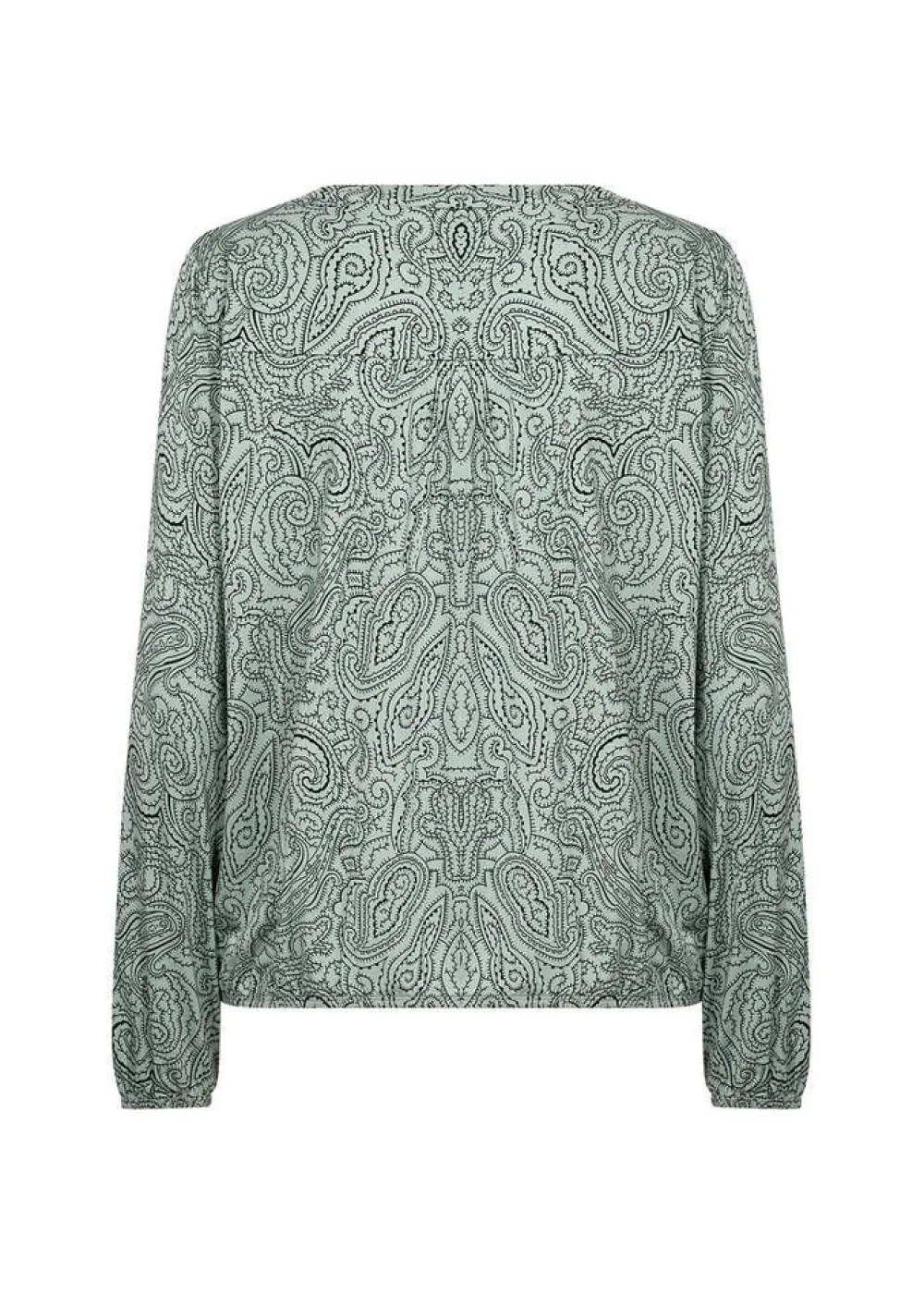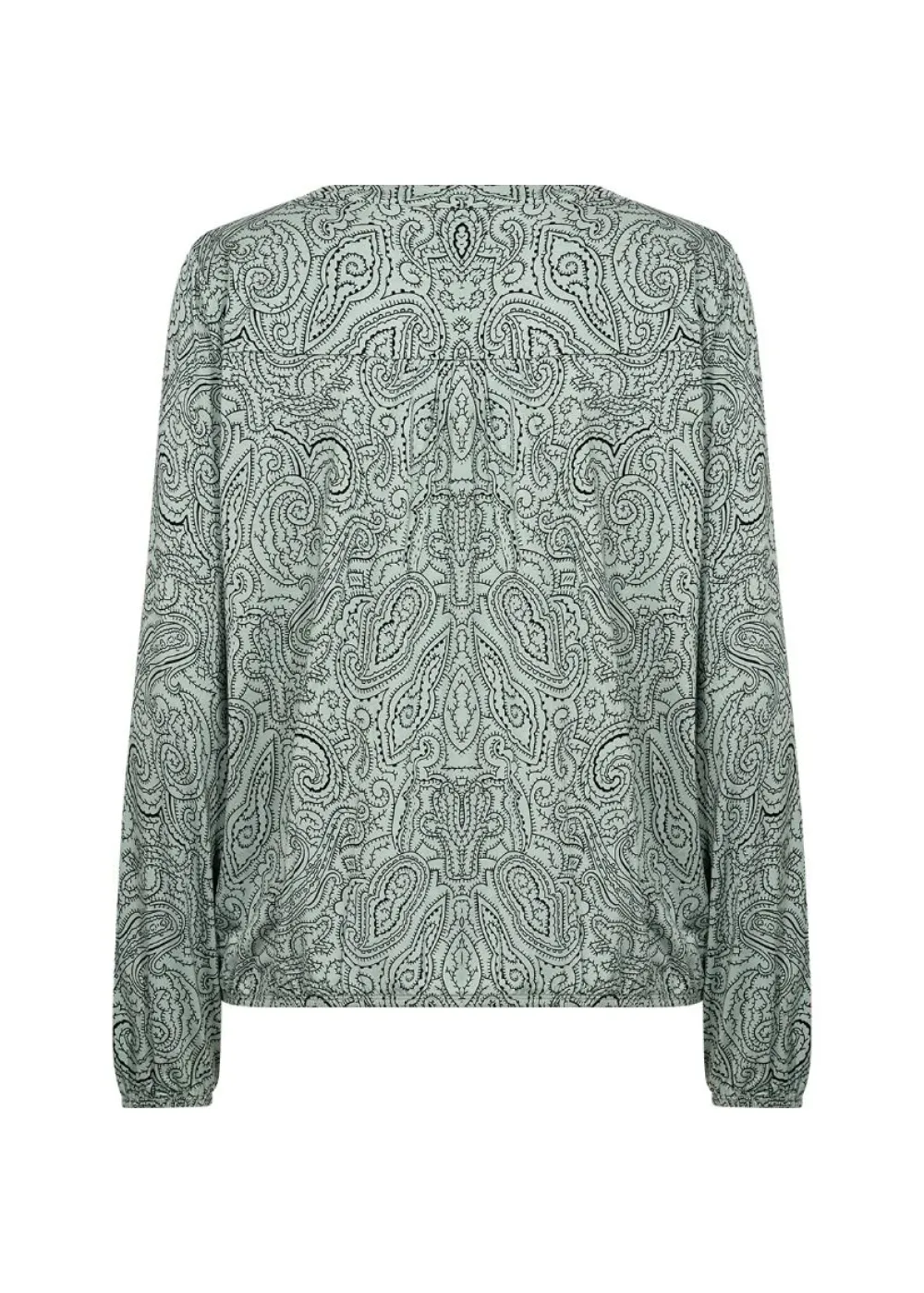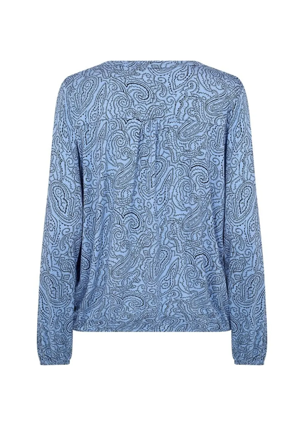 Näyttävä paisley-printillinen pusero klassisella halkiolla pääntiellä. Täyspitkissä hihoissa ja helmassa on jost…