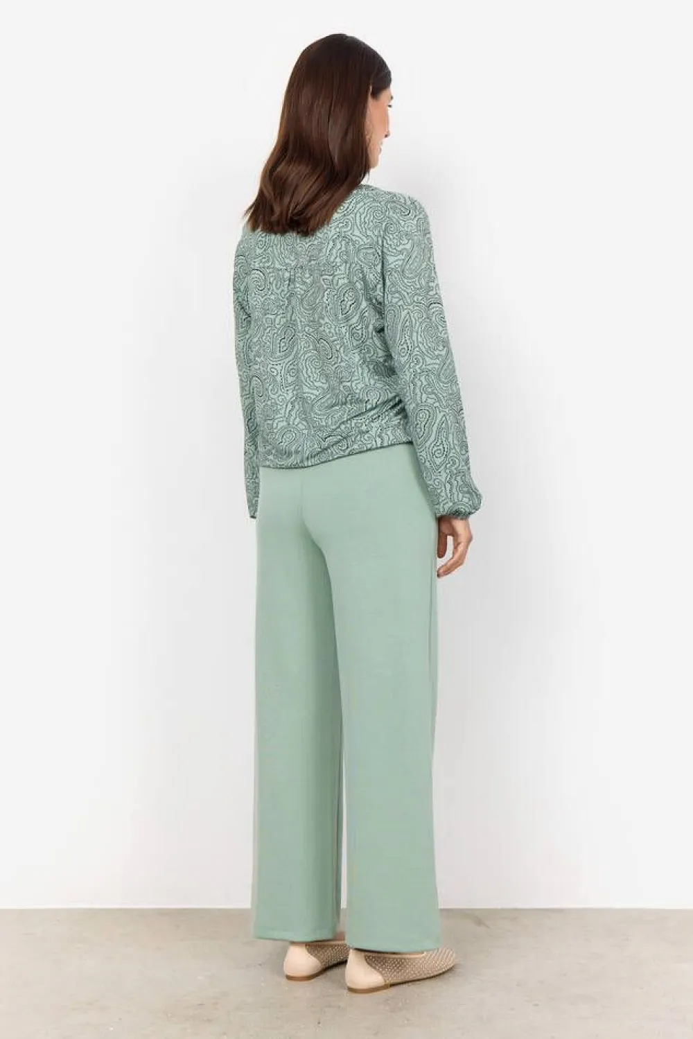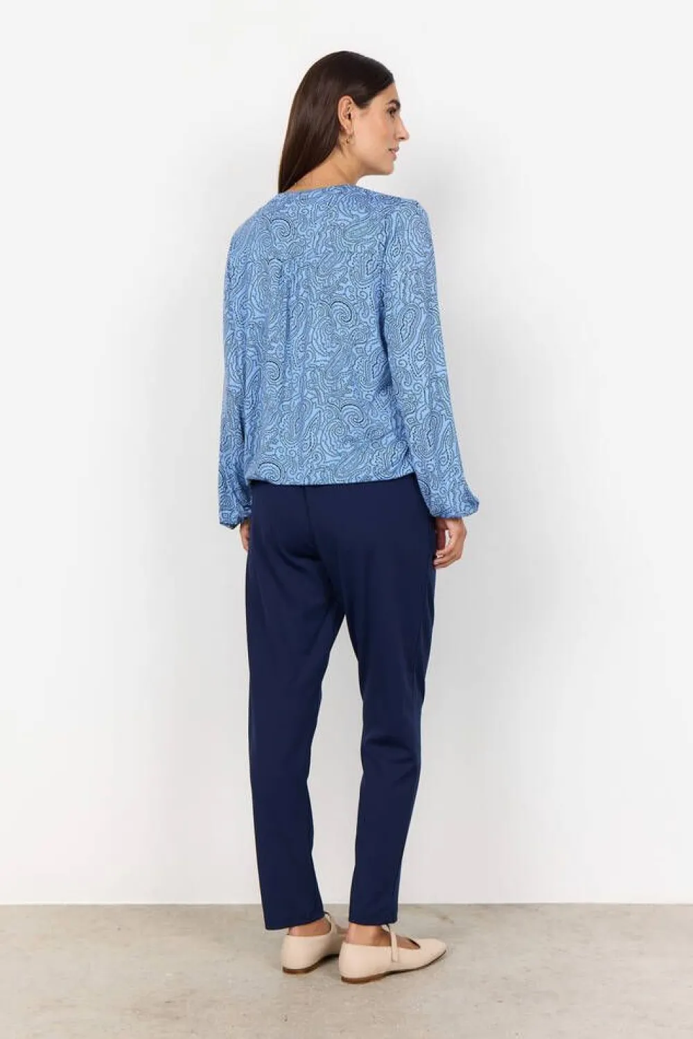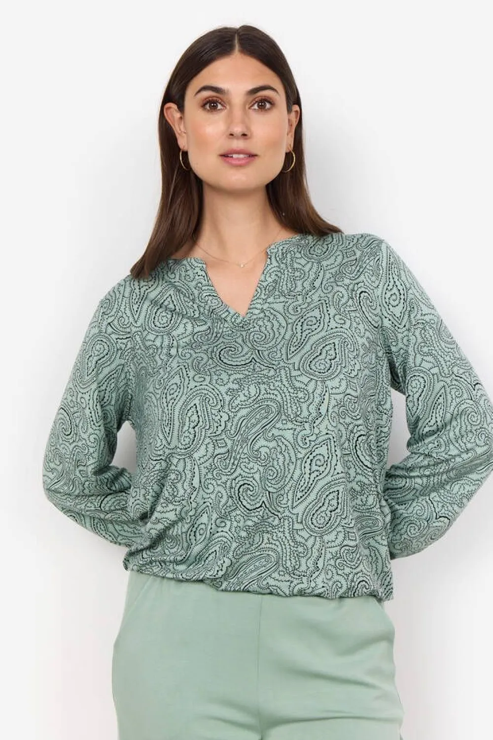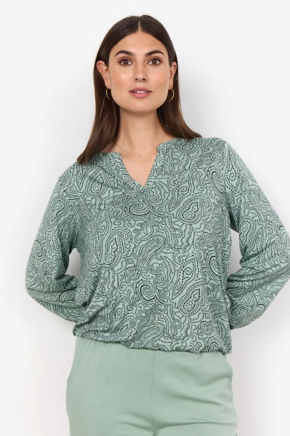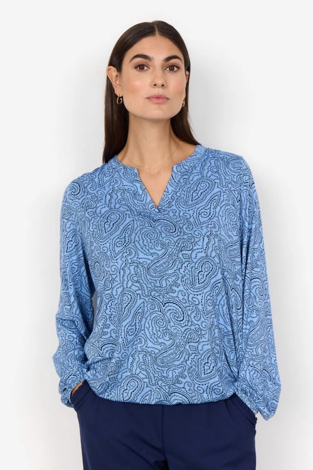 Näyttävä paisley-printillinen pusero klassisella halkiolla pääntiellä. Täyspitkissä hihoissa ja helmassa on jost…