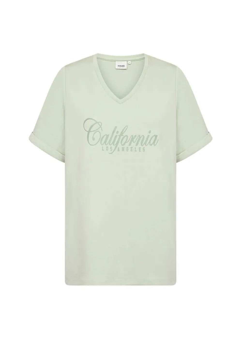 Raikkaan vaaleanvihreä lyhythihainen trikoopaita etupuolen tekstiprintillä. V-pääntie ja käännetyt hihansuut.Lisä…