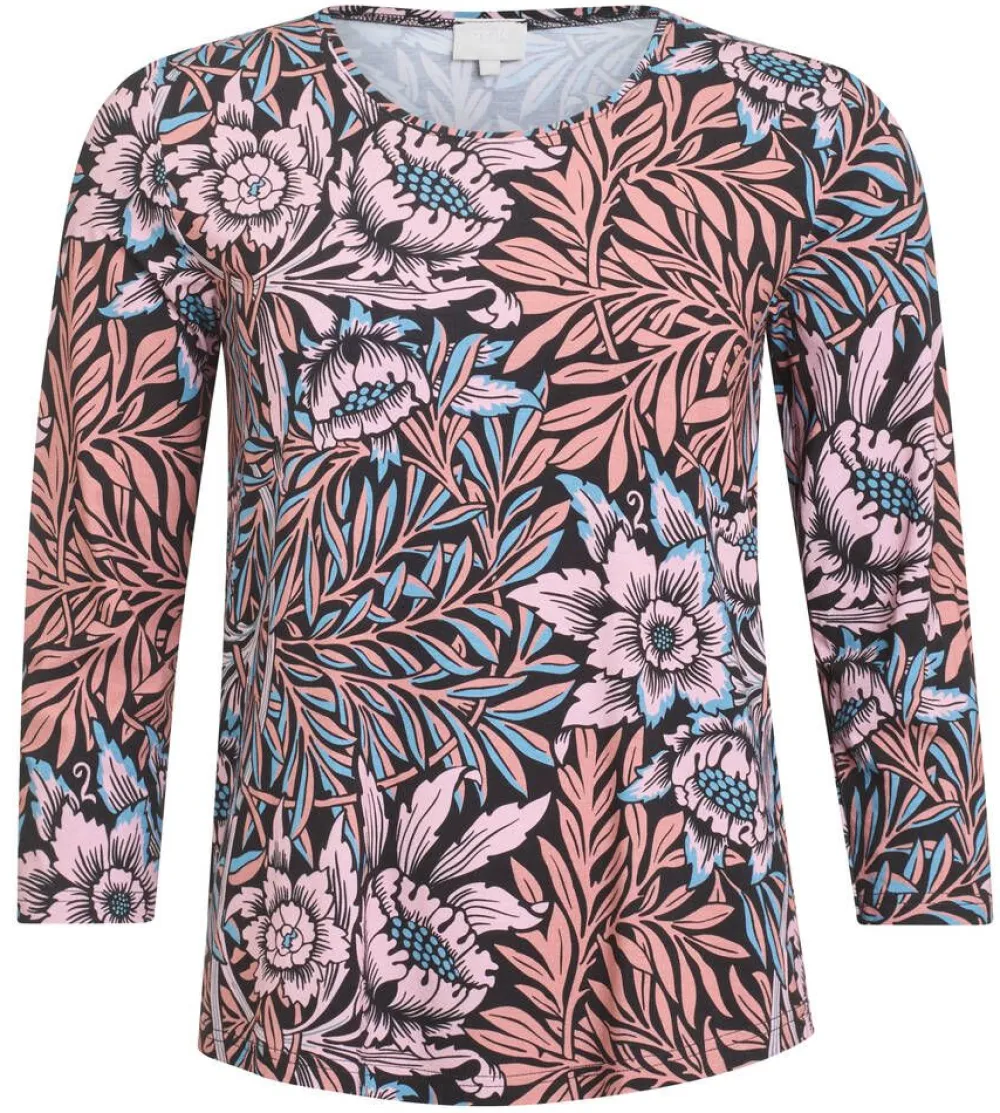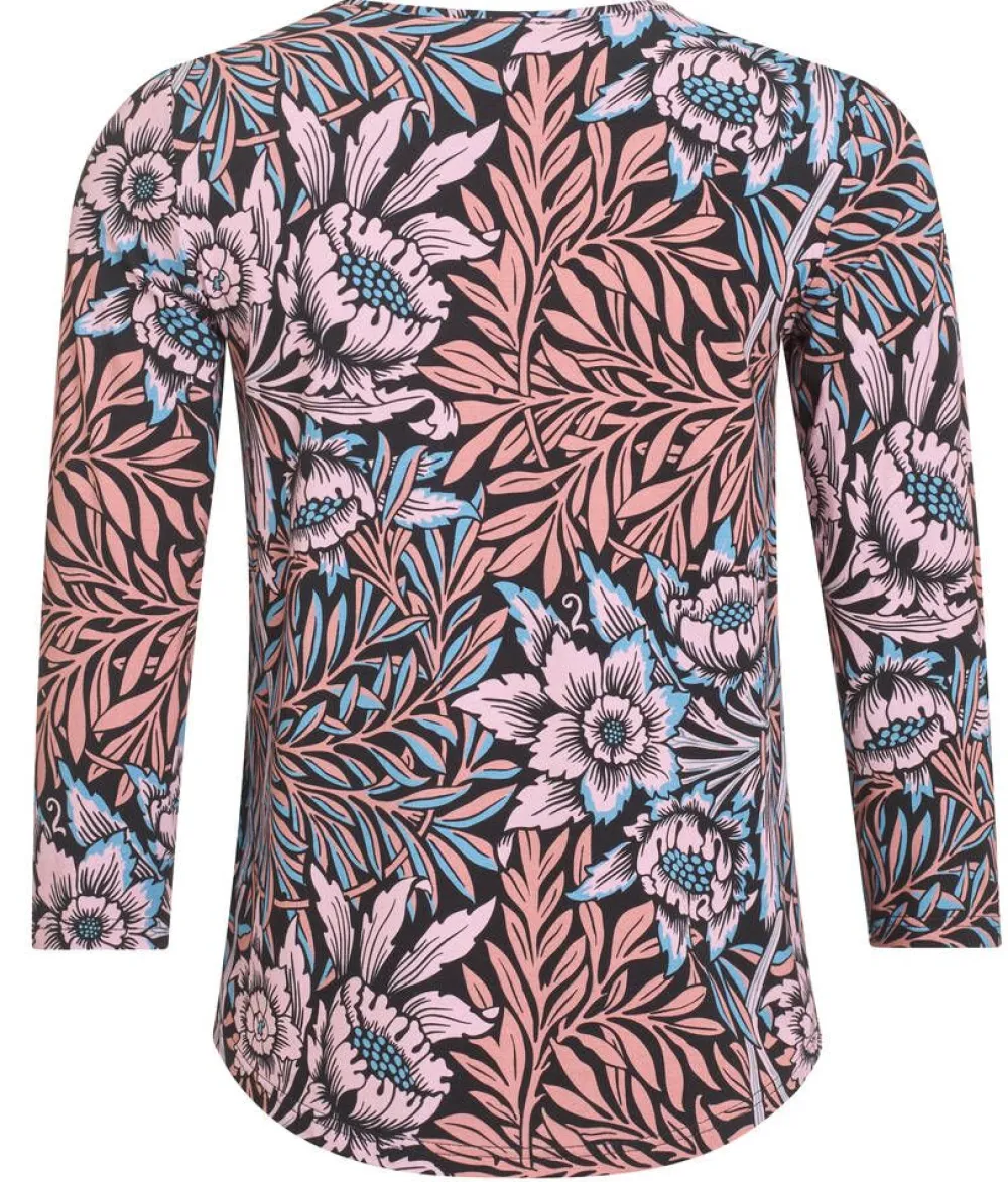 Naisellinen paita monivärisellä kukka-/lehtikuosilla ja pyöreällä pääntiellä. Paidassa on 3/4-hihat ja hieman al…