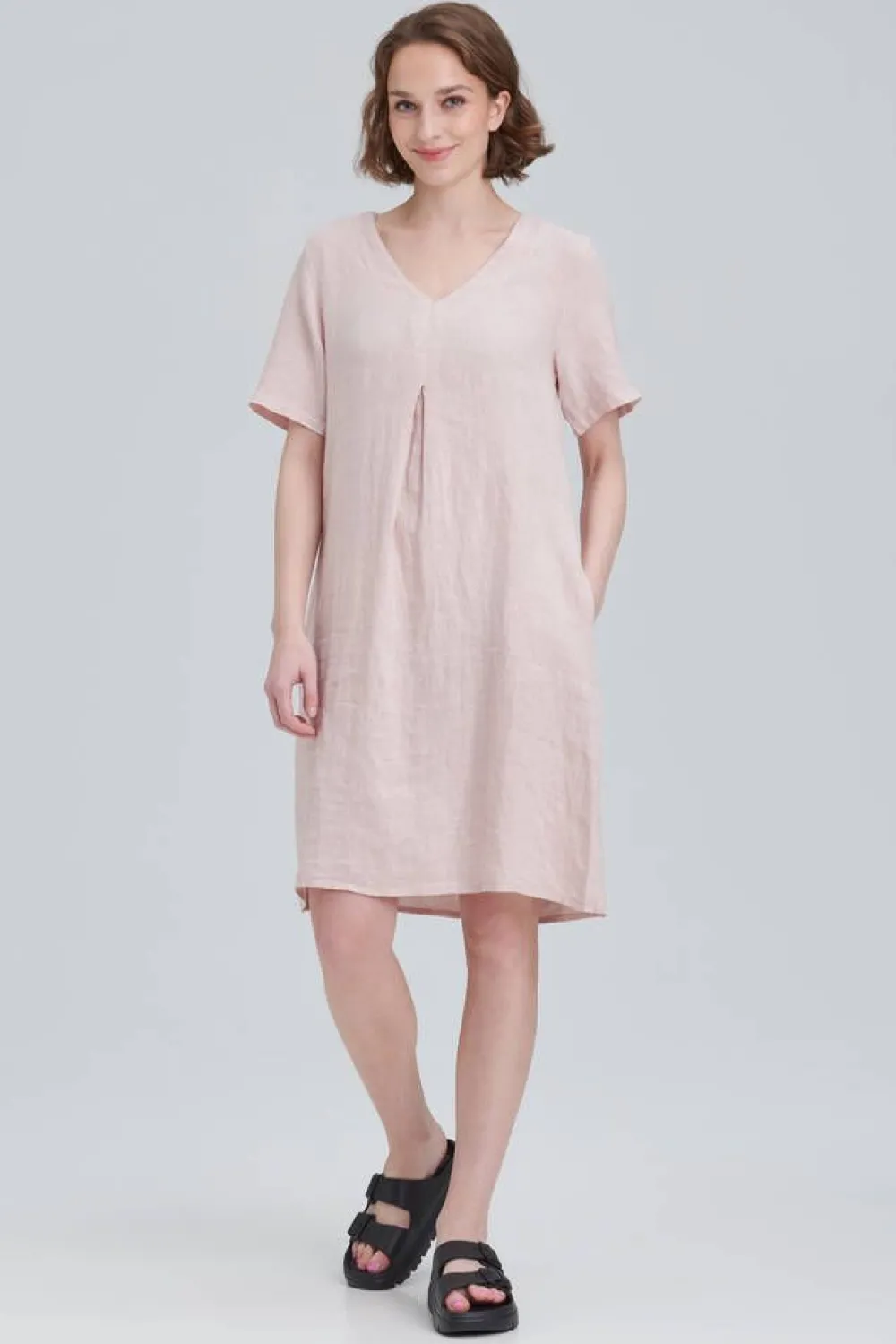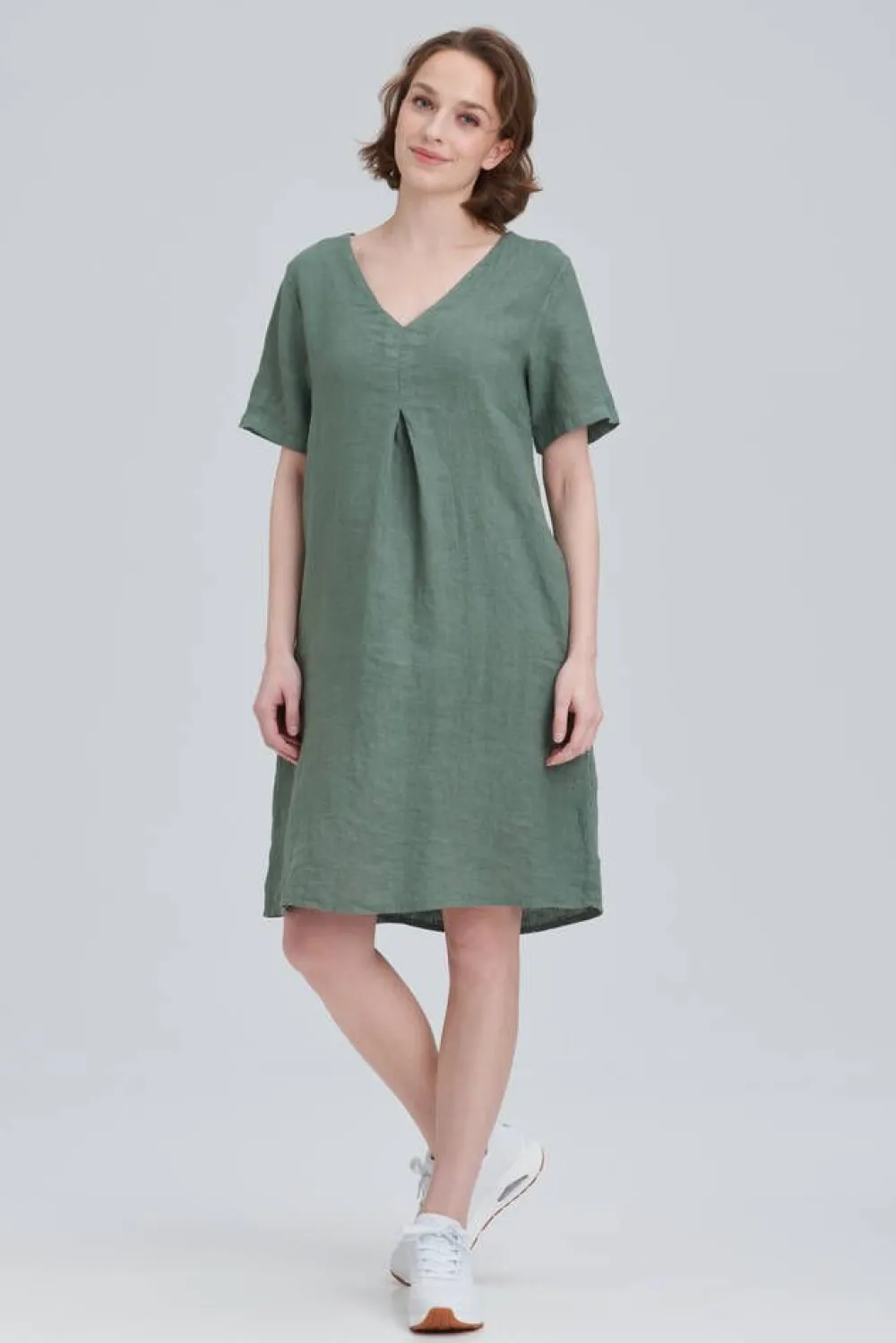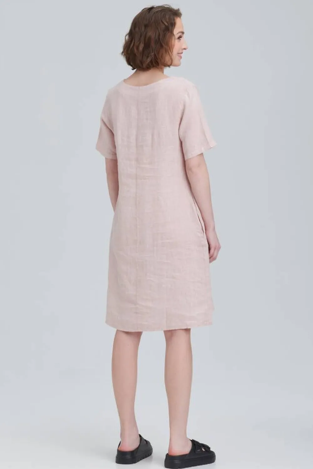 Lyhythihainen pellavamekko v-pääntiellä ja etupuolen vastalaskoksella. Sivusaumoihin on piilotettu kätevät avotasku…