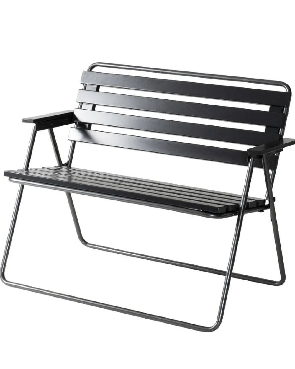 Kotimainen kokoontaitettava kahden istuttava Retro-penkki, jonka runko on valkoiseksi pulverimaalattua terästä ja puuo…