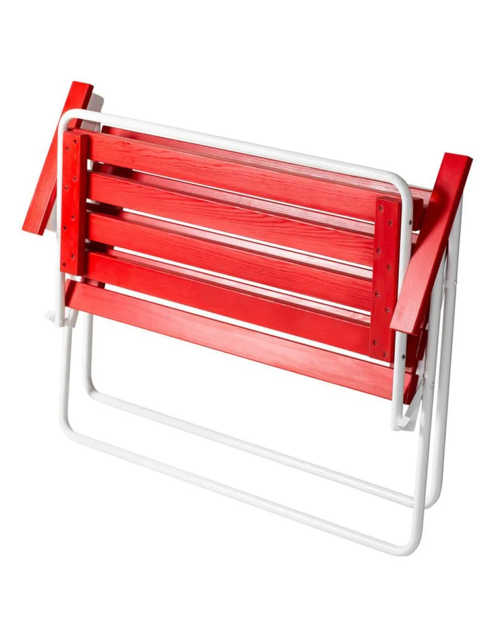 Kotimainen kokoontaitettava kahden istuttava Retro-penkki, jonka runko on valkoiseksi pulverimaalattua terästä ja puuo…