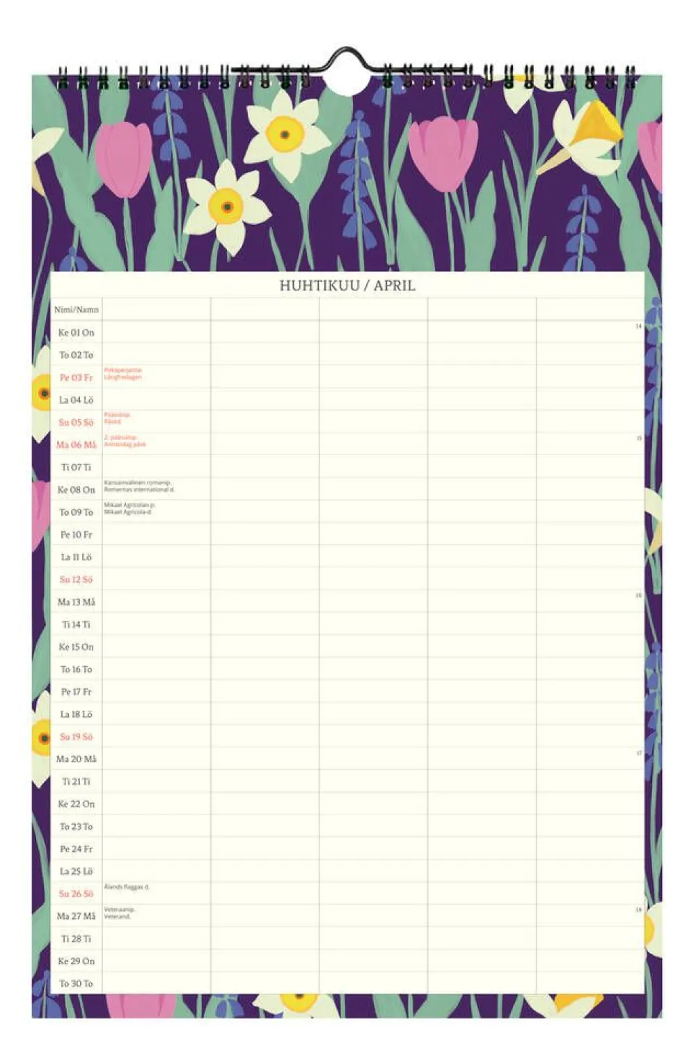Seinäkalenteri 2025, Polka Paperin ihastuttavilla kuvituksilla. Kannessa on lilan ja vaaleanpunaisen sävyisiä orvokke…