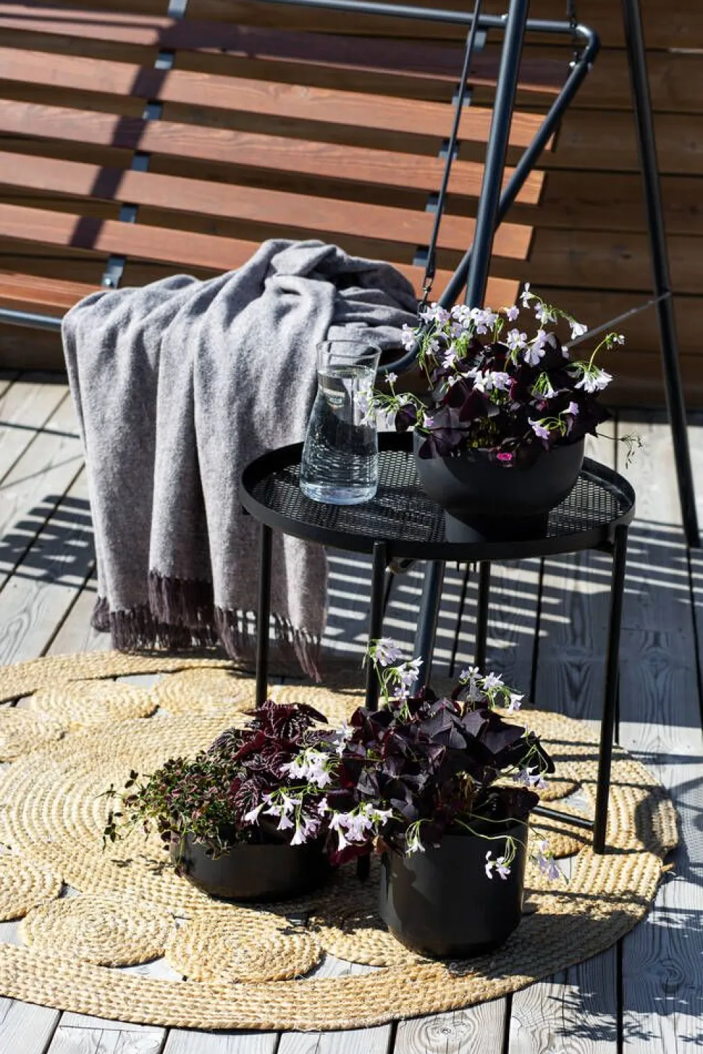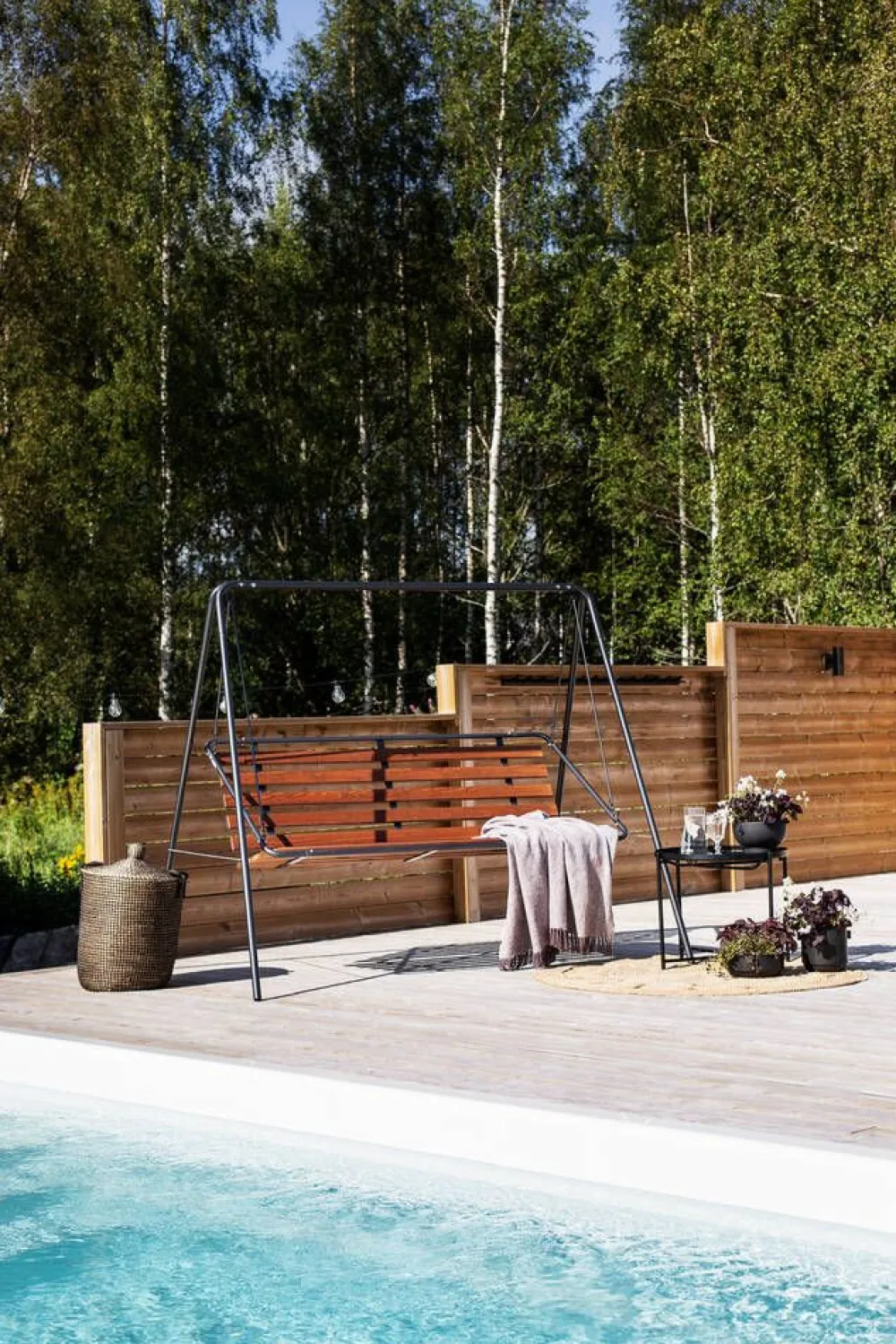 Suvisaari kolmen hengen pihakeinussa on harmaaksi pulverimaalattu teräsputkirunko ja ruskeaksi maalattu mäntypuinen is…
