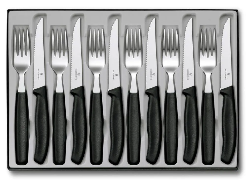 Victorinoxin korkealaatuinen ruokailuvälinesetti sisältää kuusi teräväkärkistä pihviveistä 11 cm terällä ja k…