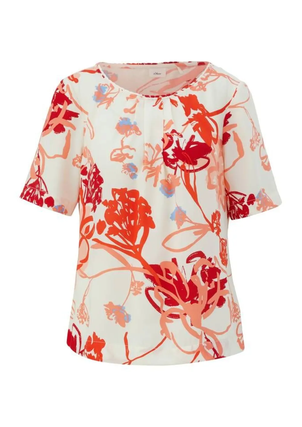 Kaunis printtipusero pyöreällä pääntiellä ja lyhyillä hihoilla. Pääntiellä on tyylikkäät laskokset.Lisää t…
