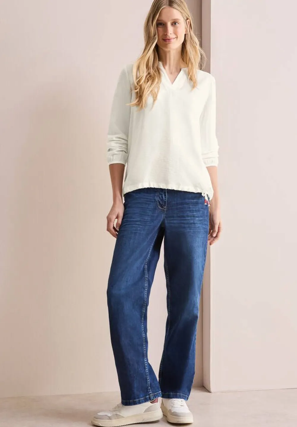 Rennon tyylikäs pusero v-pääntiellä ja pitkillä hihoilla. Helmassa on kiristysnauha punaisilla yksityiskohdilla.Lis…
