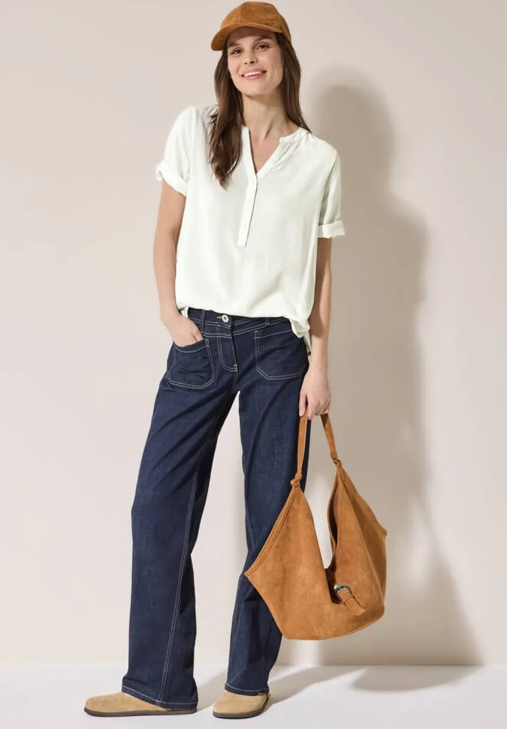 Klassisen tyylikäs pusero puolinapituksella ja lyhyillä käärittävillä hihoilla. Pusero on takaa hieman pidempi.Lis…