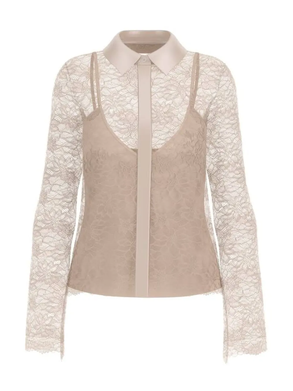 Supertrendikäs ja naisellisia piirteitä esiintuova pitsinen kauluspusero, jonka alla on spagettiolkaiminen alustoppi. …