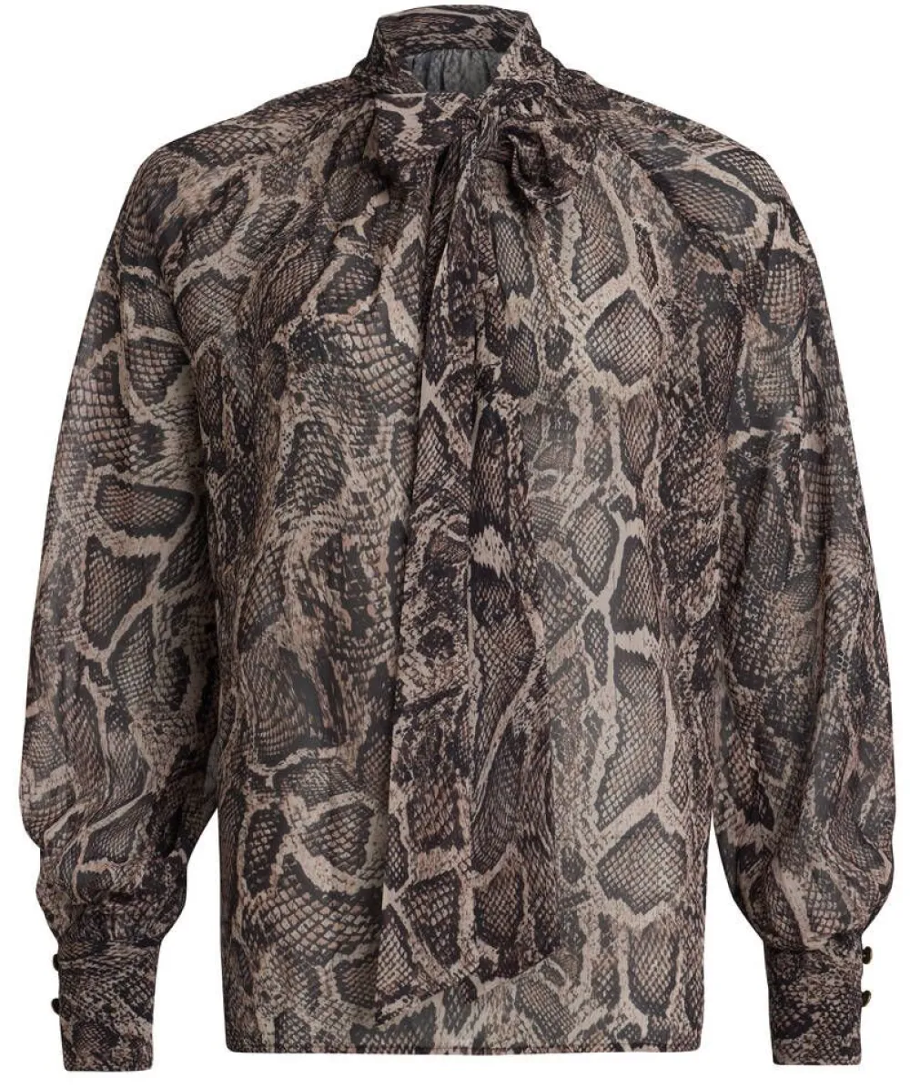 Naisellinen läpikuultava pusero trendikkäällä käärmekuosilla. Huivikaulus ja pitkät hihat, joissa on napit hihans…