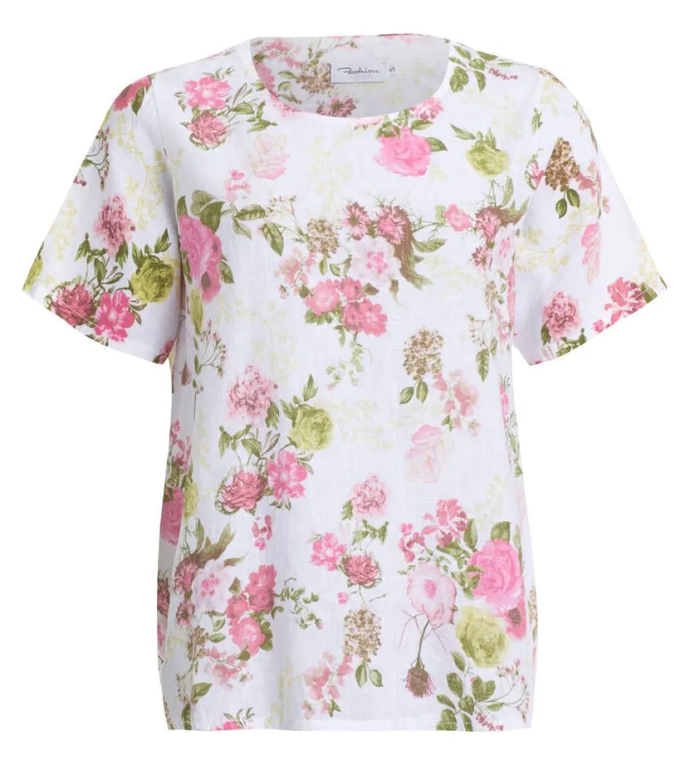 Pellavasekoitteinen pusero O-pääntiellä ja lyhyillä hihoilla. Kevyessä puserossa on hempeä kukkakuosi.Lisää tiet…