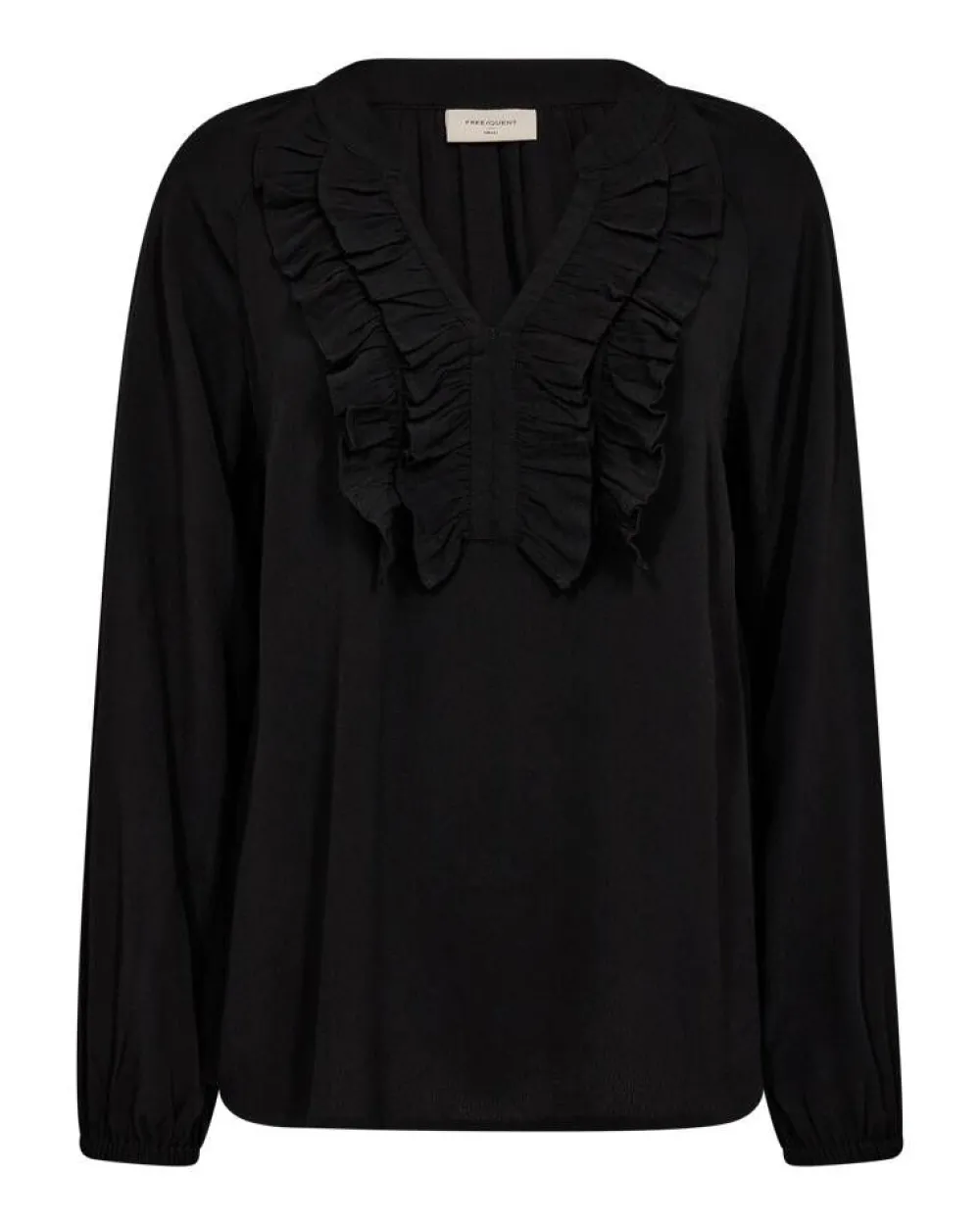 Näyttävä yksivärinen pusero röyhelöillä ja imartelevalla v-pääntiellä. Hihansuissa on joustavat kuminauhat, jo…