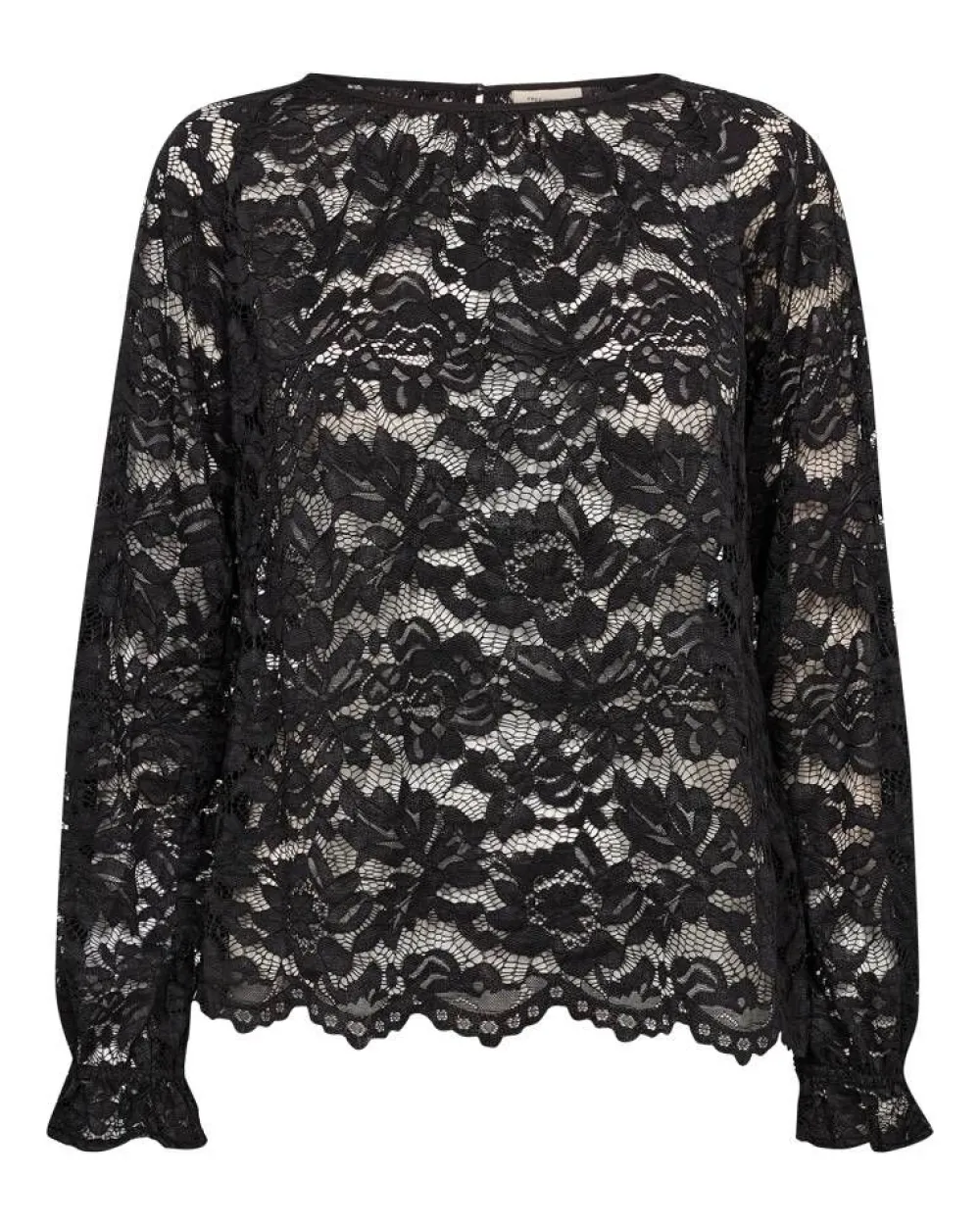 Pitsinen naisten pusero pitkillä hihoilla. Puserossa on O-pääntie, jossa on takana nappi sekä edessä rypytystä. Hi…