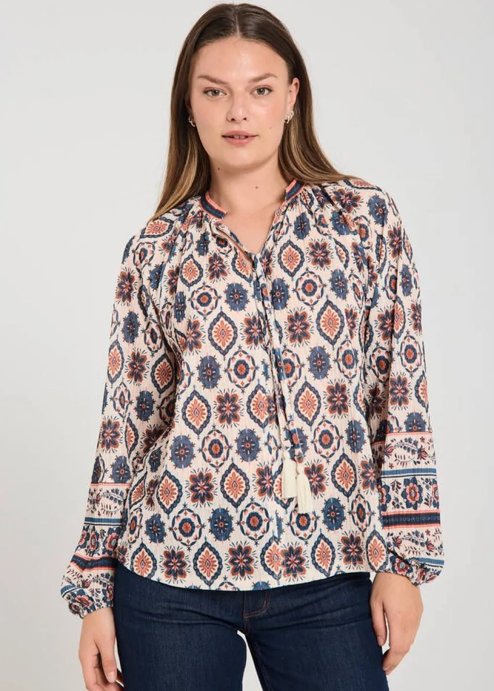Tyylikäs pitkähihainen pusero etnisellä kuosilla. Paidan hihansuissa on ohuet kuminauhat tuomassa istuvuutta ja kevey…