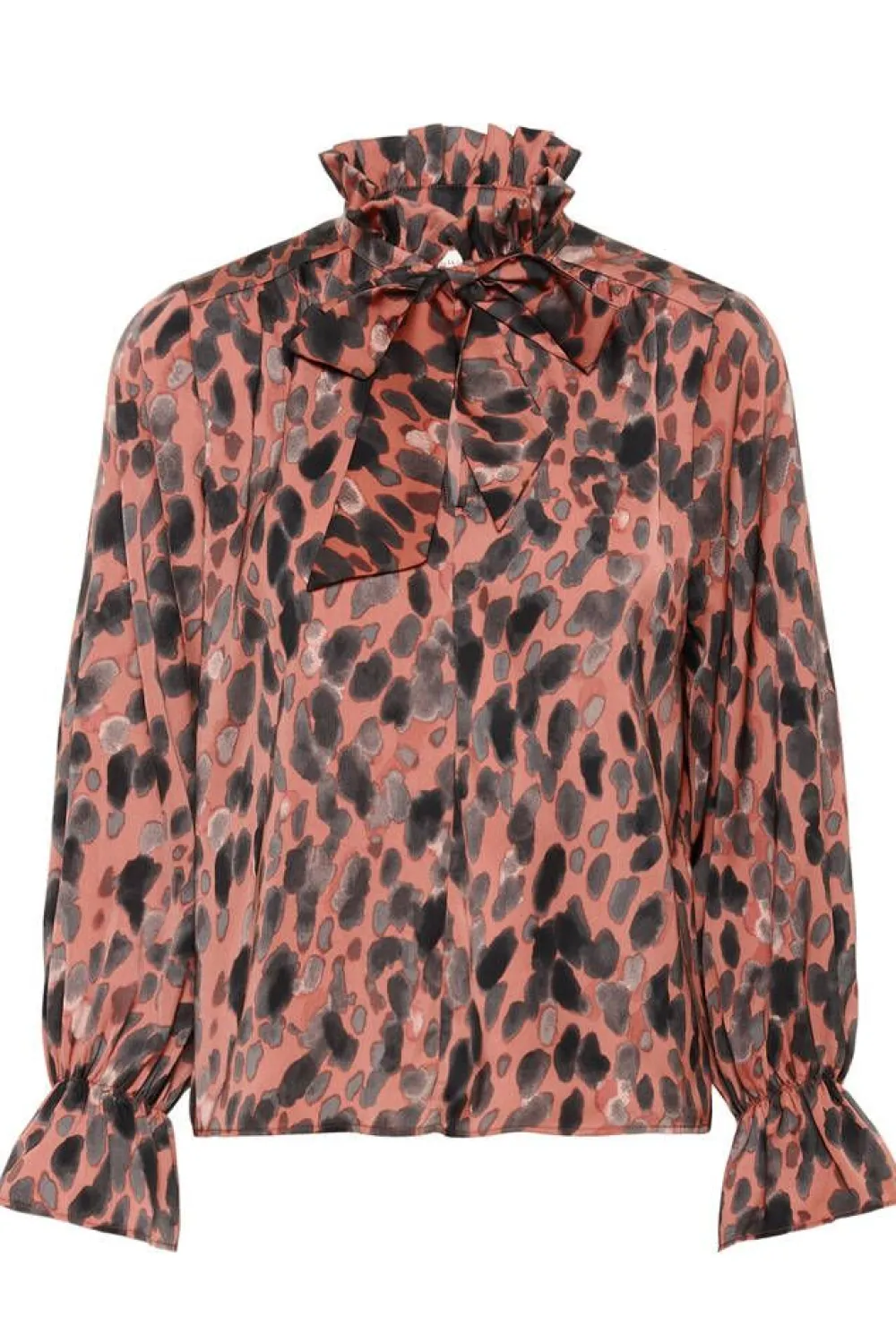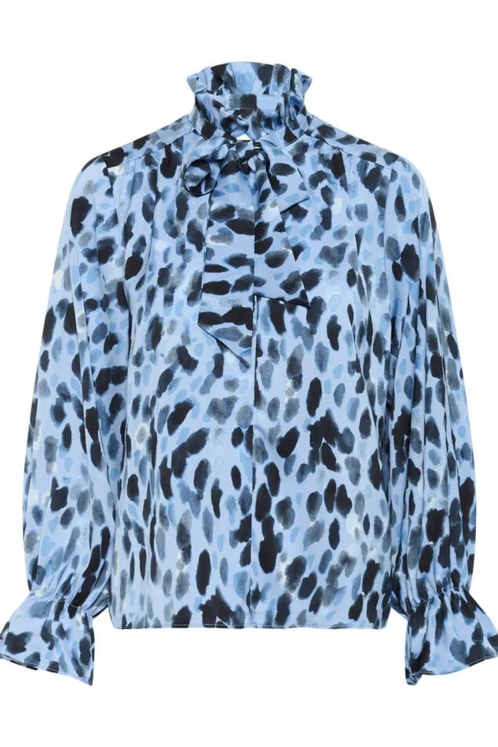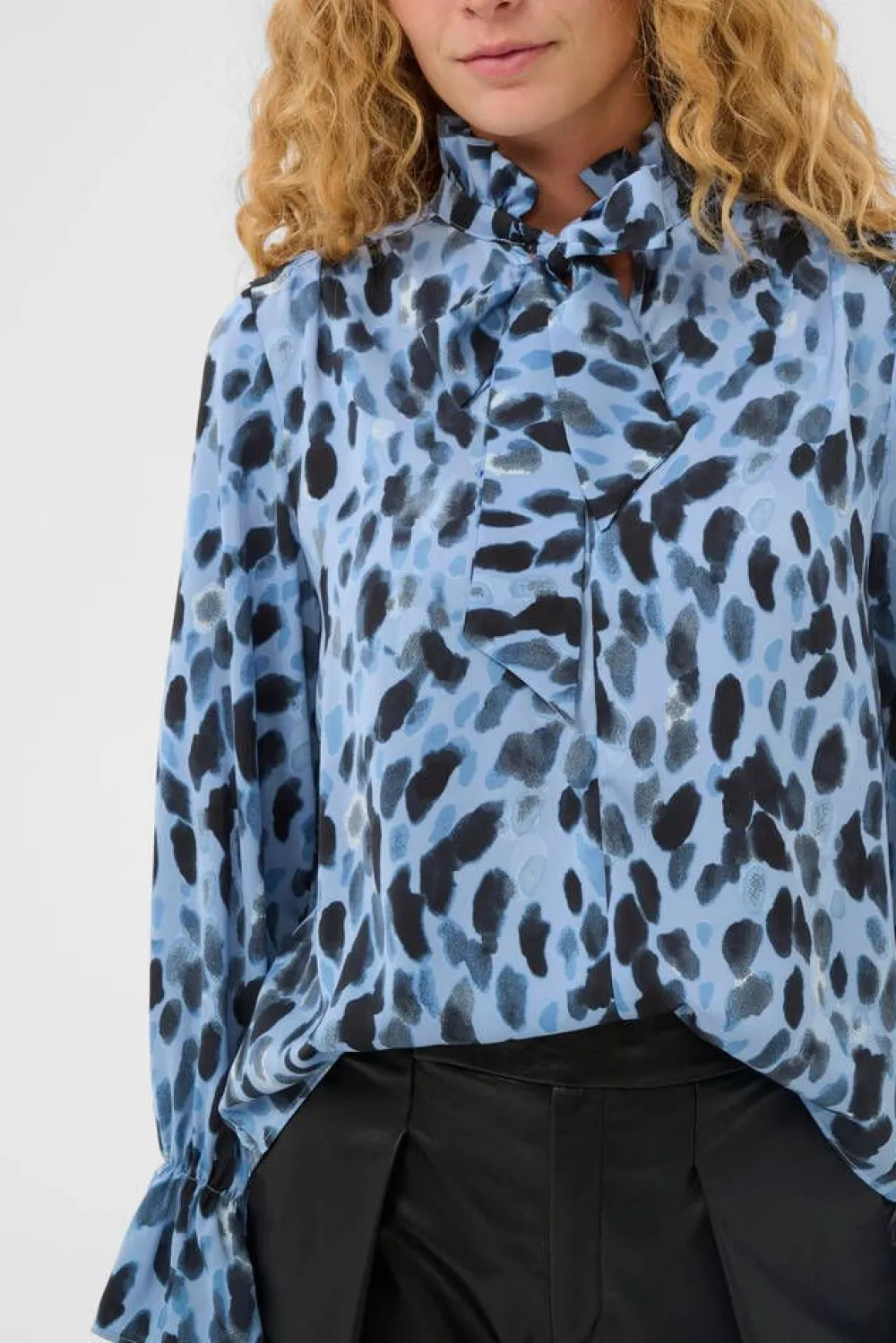 Huipputrendikäs täpläkuosinen pusero frillallisella huivikauluksella ja pitkillä hihoilla, joissa on ranteiden kohda…