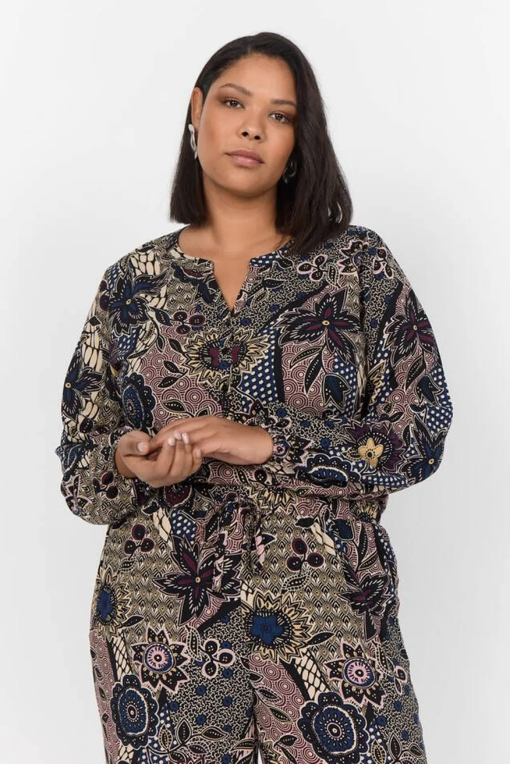 Pitkähihainen printtipusero pääntien puolinapituksella ja kuminauhahelmalla.Lisää tietojaPlus-mitoitusHoito-ohje:Ve…