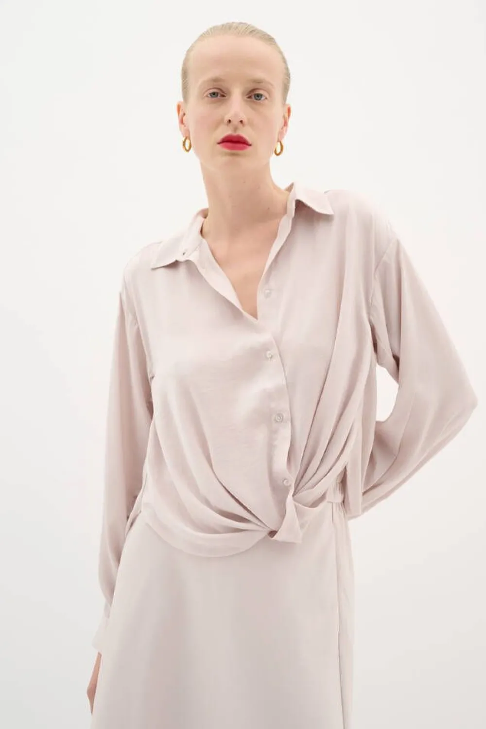 Hempeä kauluspusero epäsymmetrisellä pussimaisella solmukehelmalla. Edessä on napit.Lisää tietojaMateriaali:68% po…