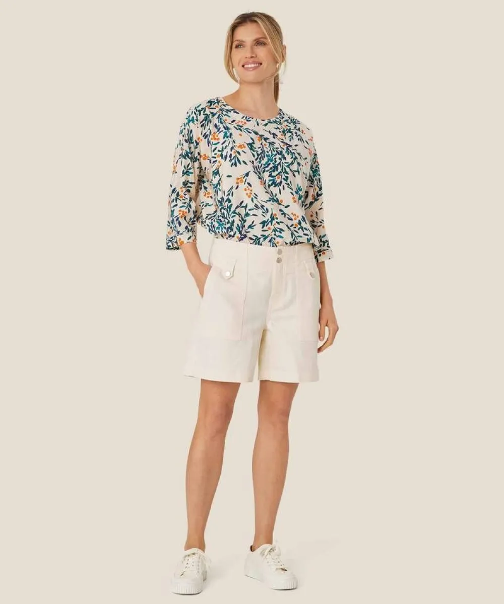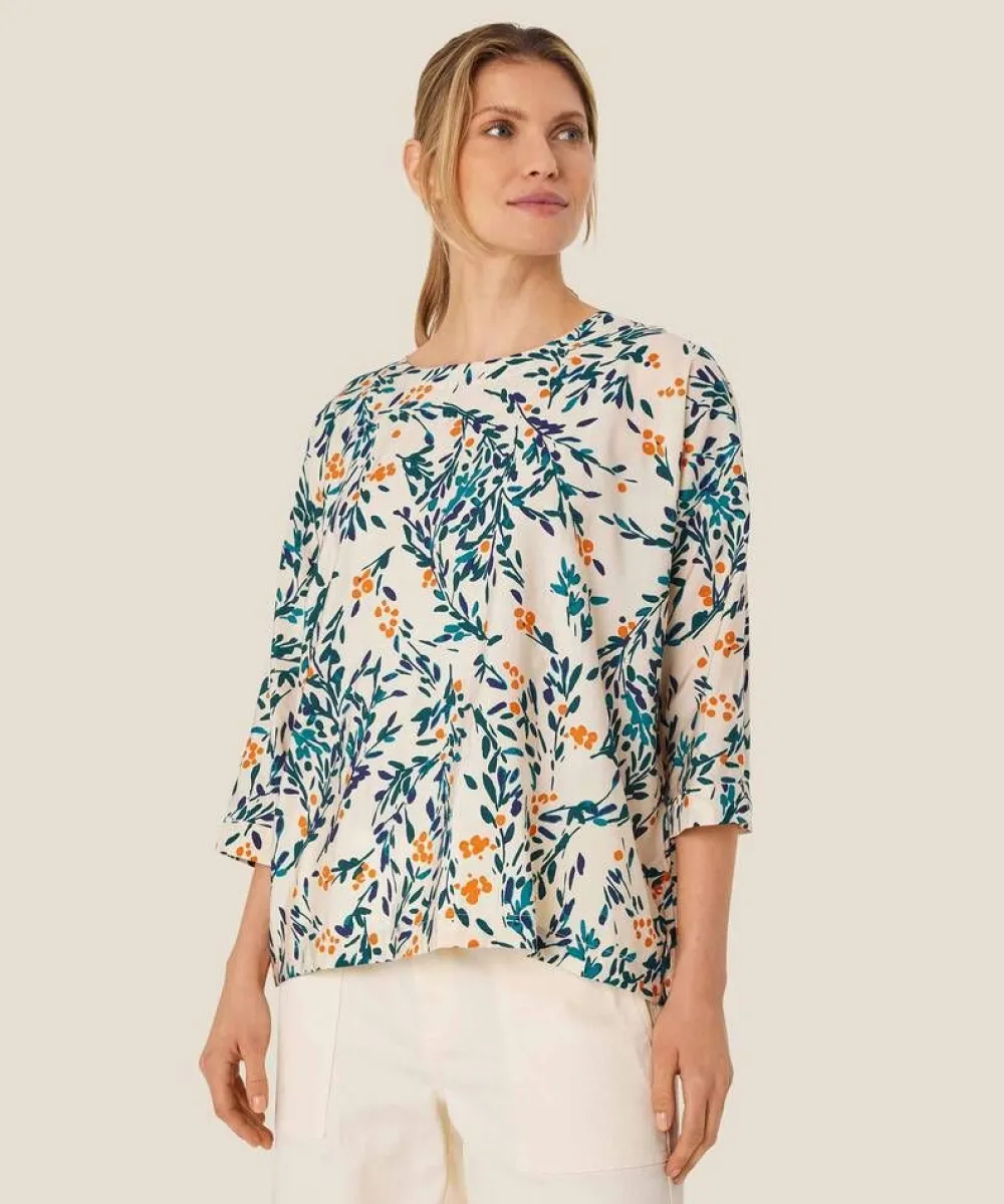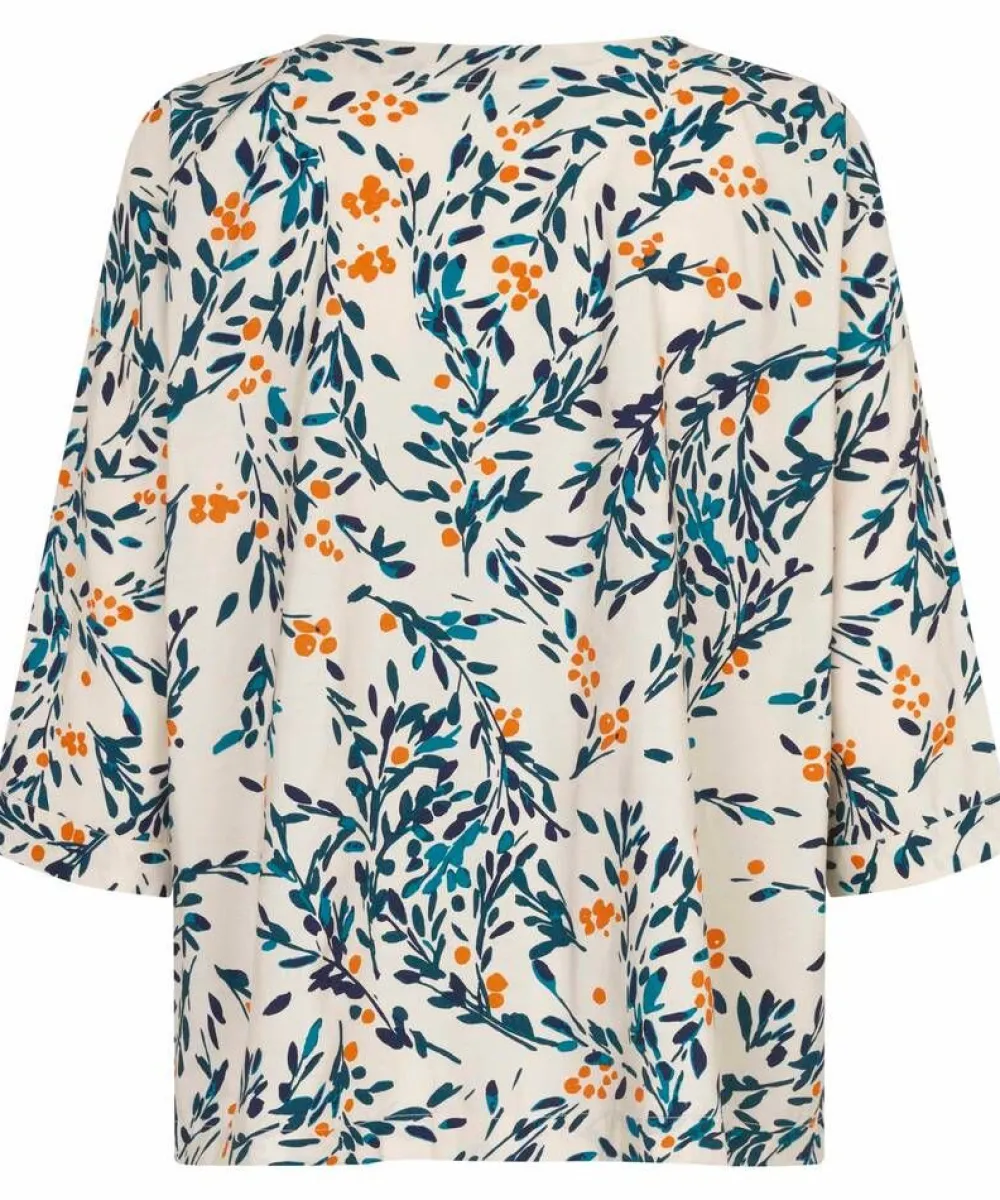 Kevyt ja ilmava vaaleapohjainen pusero tyylikkäällä lehtikuosilla ja vajaamittaisilla hihoilla. Oversize-mitoitus tak…