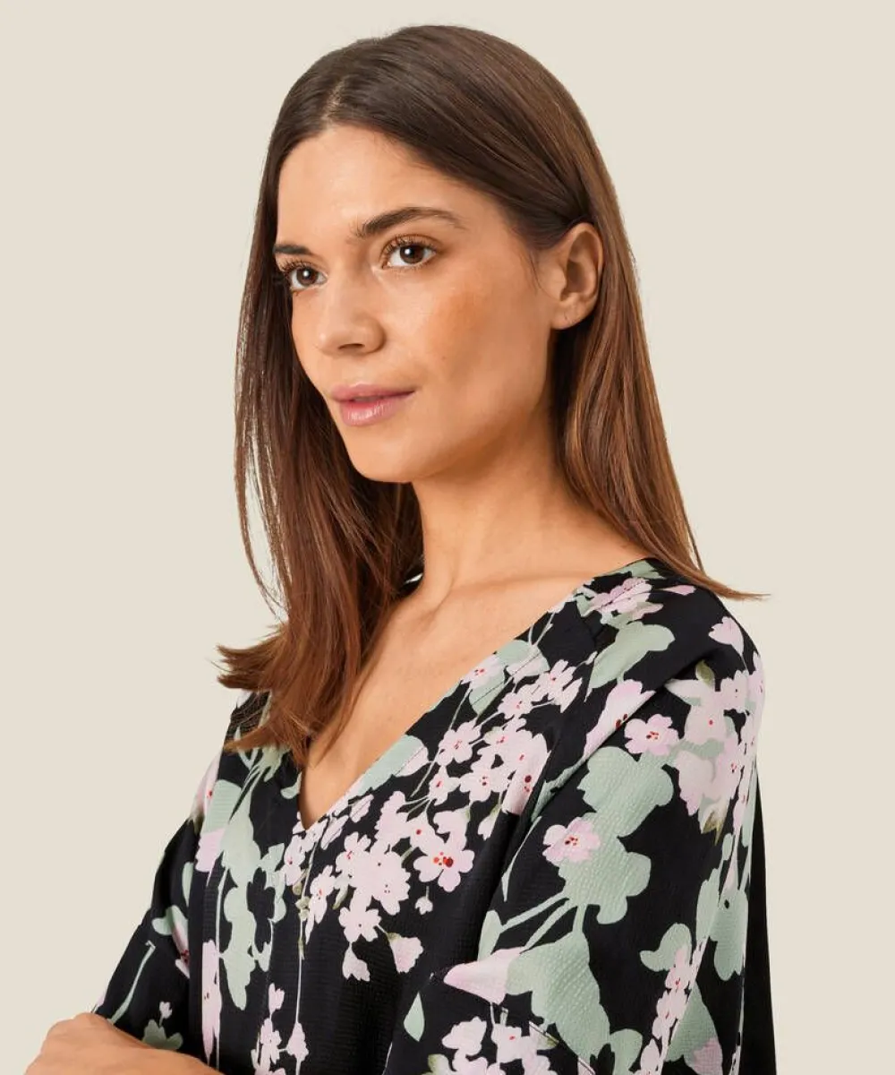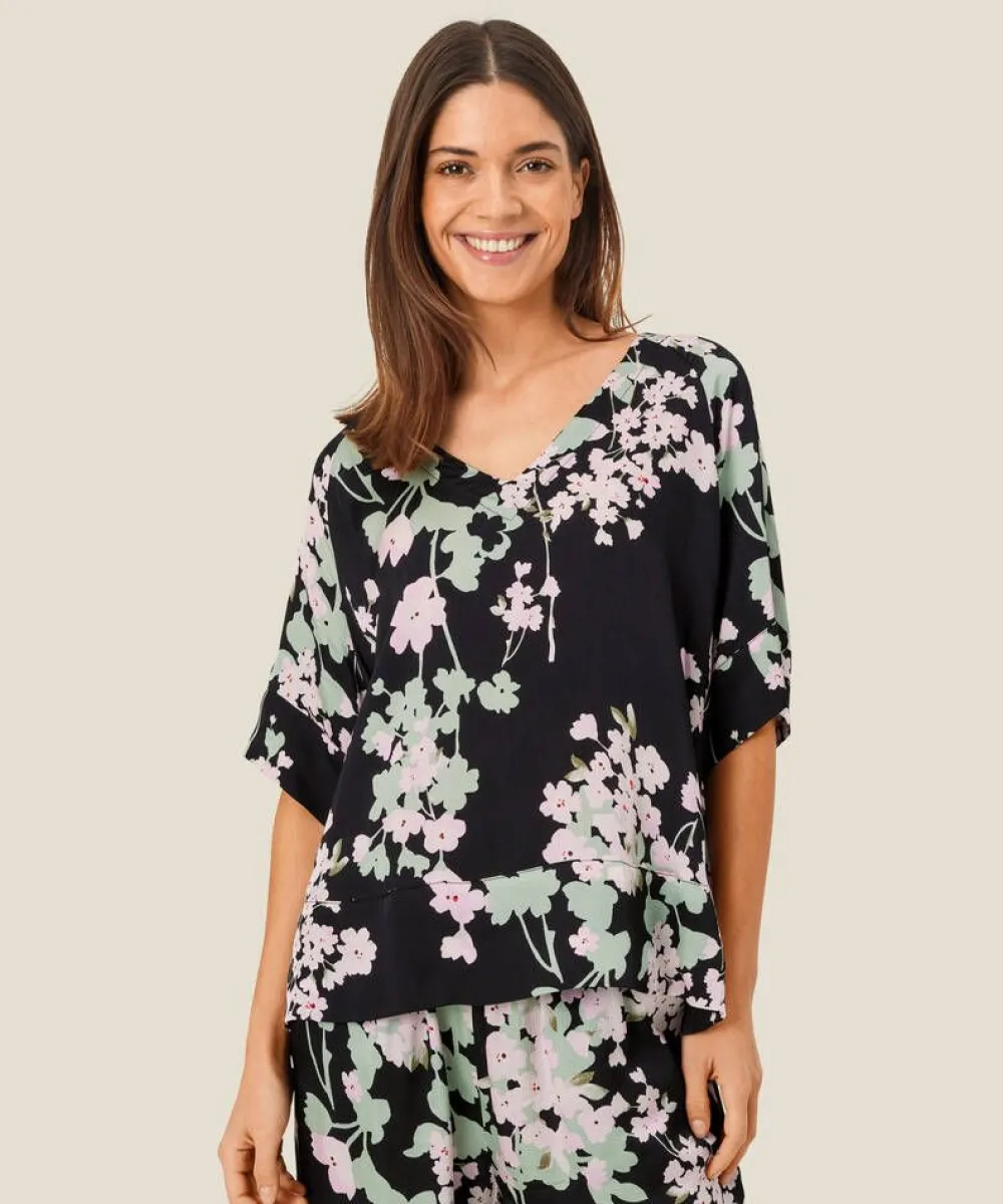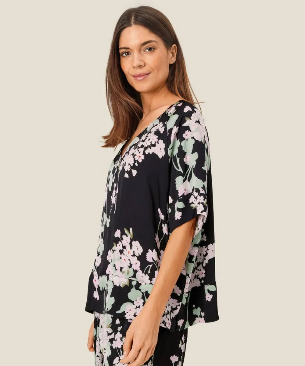 Kaunis kukallinen pusero kevyestä viskoosisatiinista. Väljä istuvuus ja näyttävä v-pääntie.Lisää tietojaMateri…
