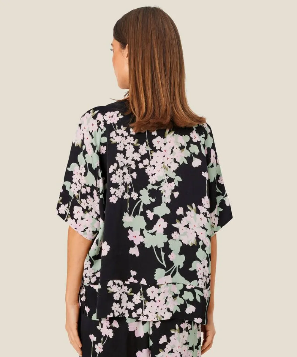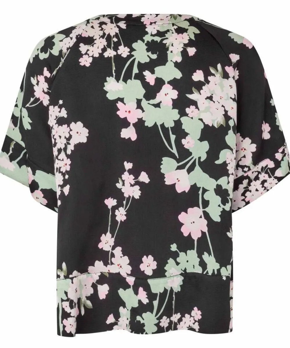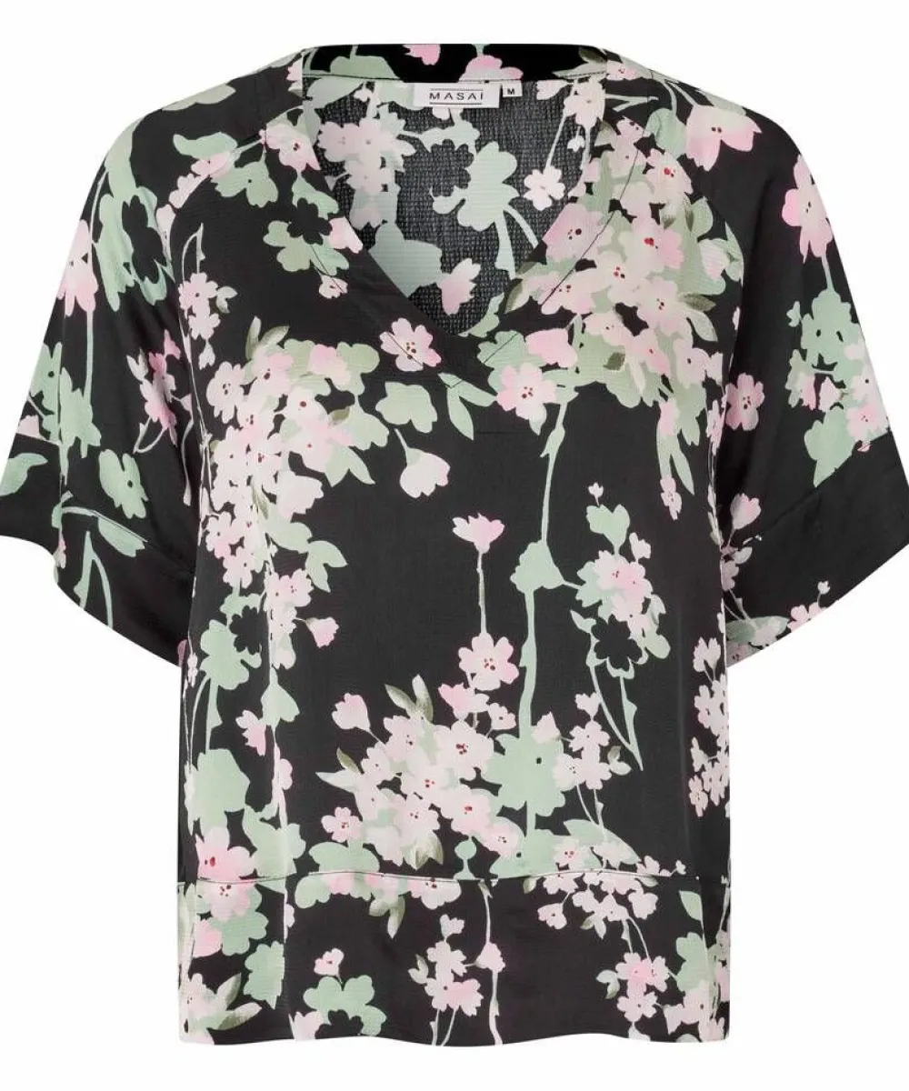 Kaunis kukallinen pusero kevyestä viskoosisatiinista. Väljä istuvuus ja näyttävä v-pääntie.Lisää tietojaMateri…