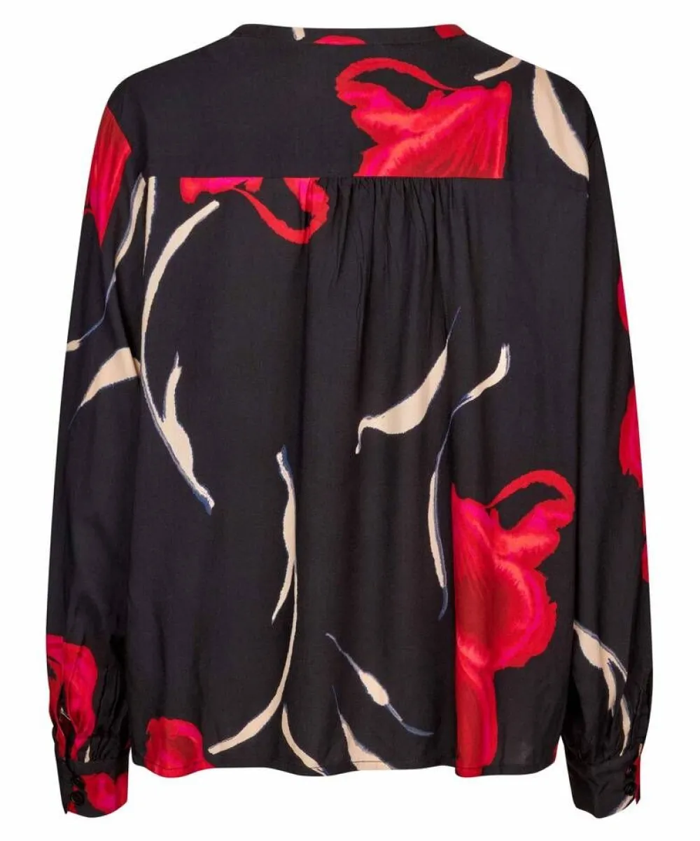 Tyylikäs punakuosillinen pusero, jossa on pääntiellä solmittava nauha.Lisää tietojaMateriaali:100% viskoosiValmist…
