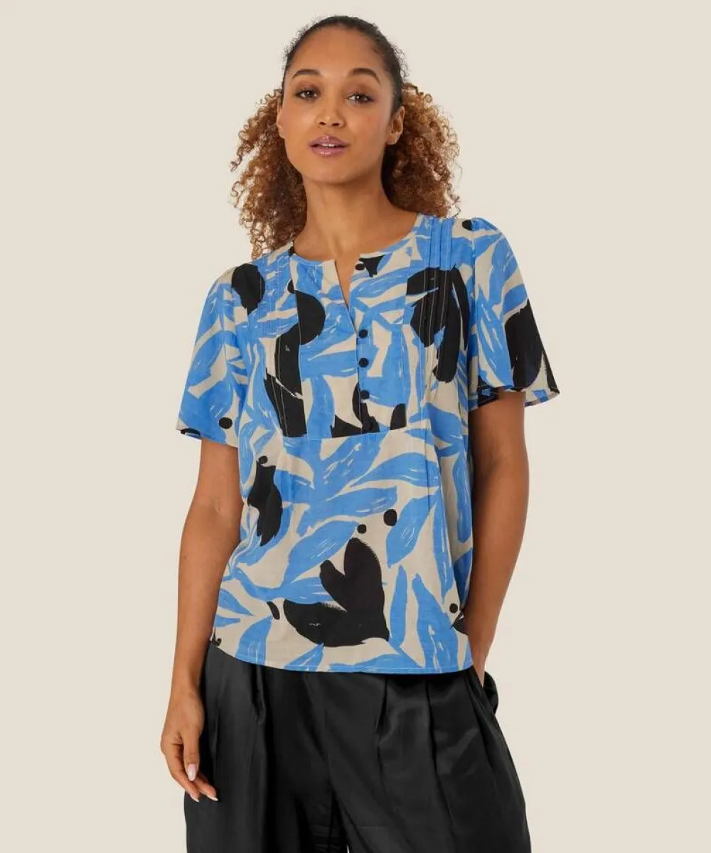 Kesäinen suoran mallinen pusero lehtikuosilla. Paidassa on rennosti istuvat lyhyet hihat ja napitus etupuolella.Lisää…