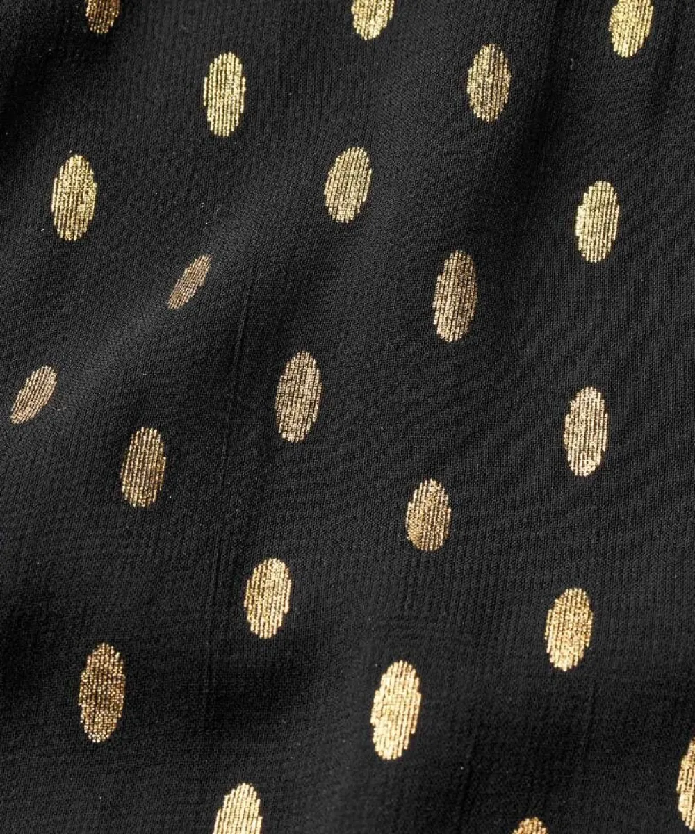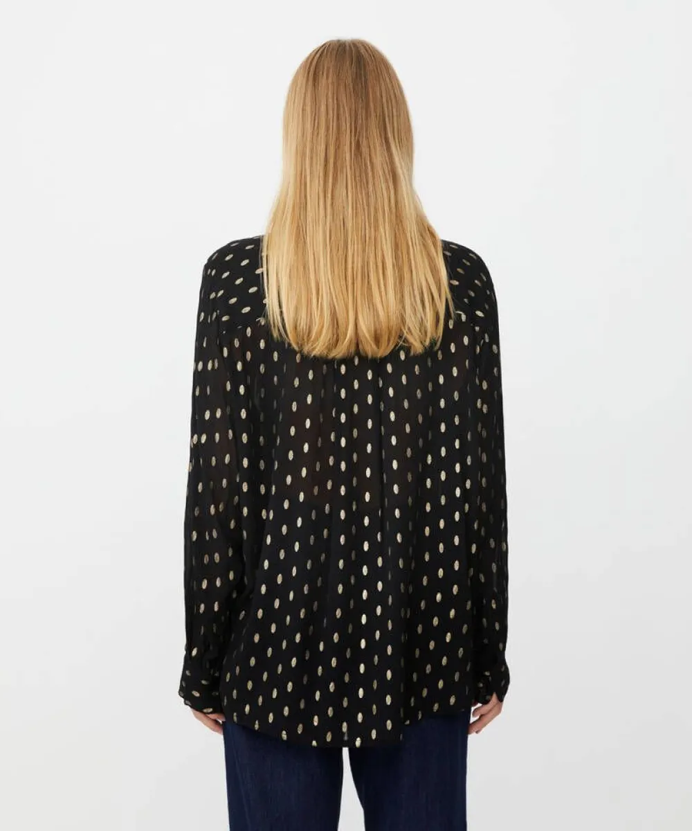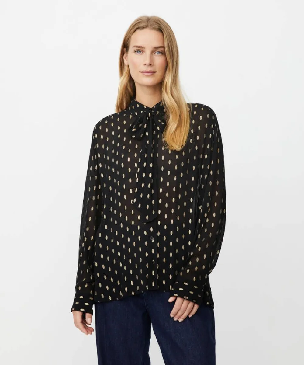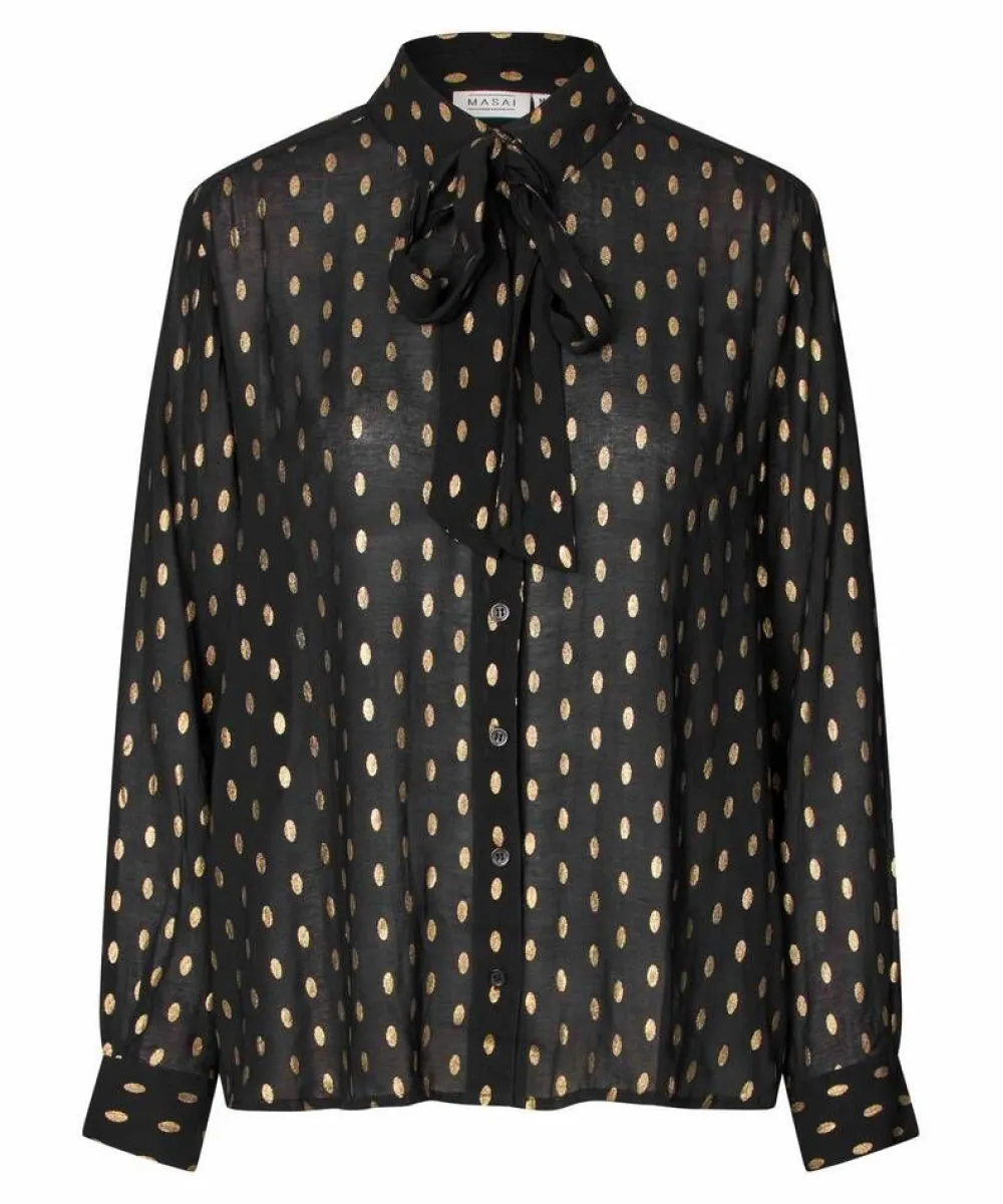 Huipputrendikäs kultatäpläinen pusero juhlakauteen, väljä A-linjainen malli. Puserossa on irrotettava rusetti.Lisä…