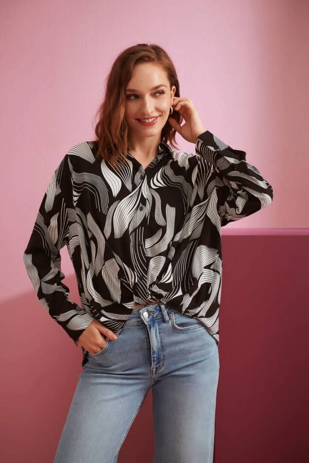 Trendikäs kevyt kauluksellinen pusero, jossa on ommeltu solmu helmassa.Lisää tietojaRinnanympärys (koko 36): 120 cmV…