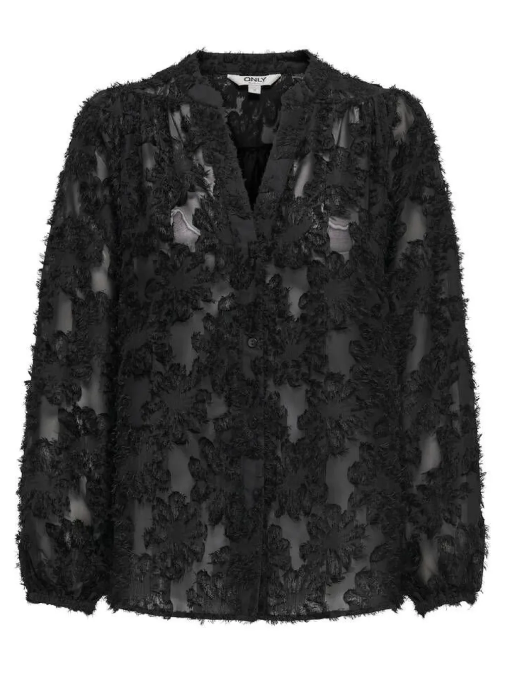 Trendikäs kohokuvioitu pusero läpikuultavasta kankaasta. Pitkät hihat ja napitus edessä.Lisää tietojaKiinnitys:Nap…