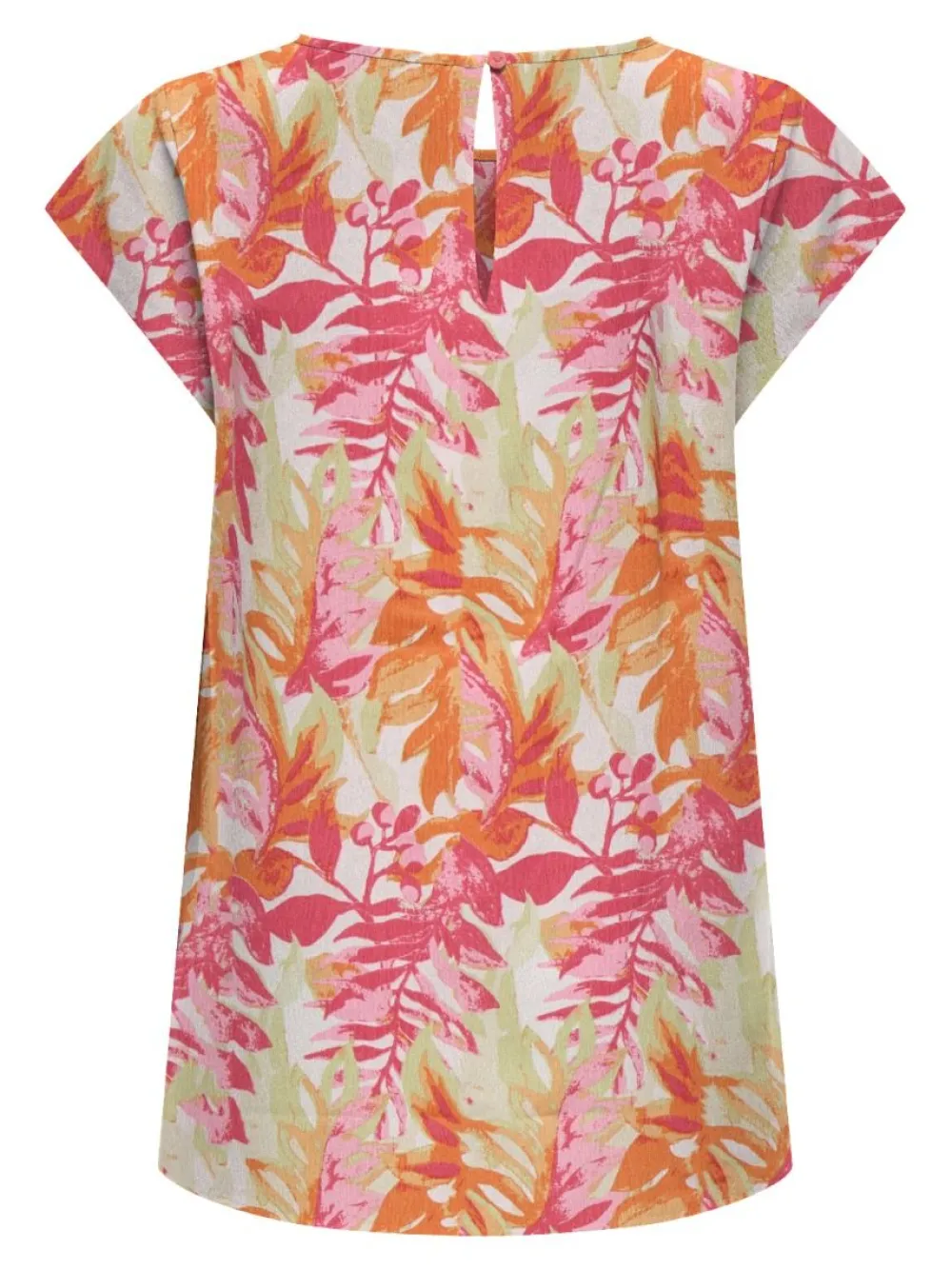 Kaunis kuosillinen pusero lyhyillä hihoilla. Niskalla on nappikiinnitys ja helma on takaa hieman pidempi.Lisää tietoj…