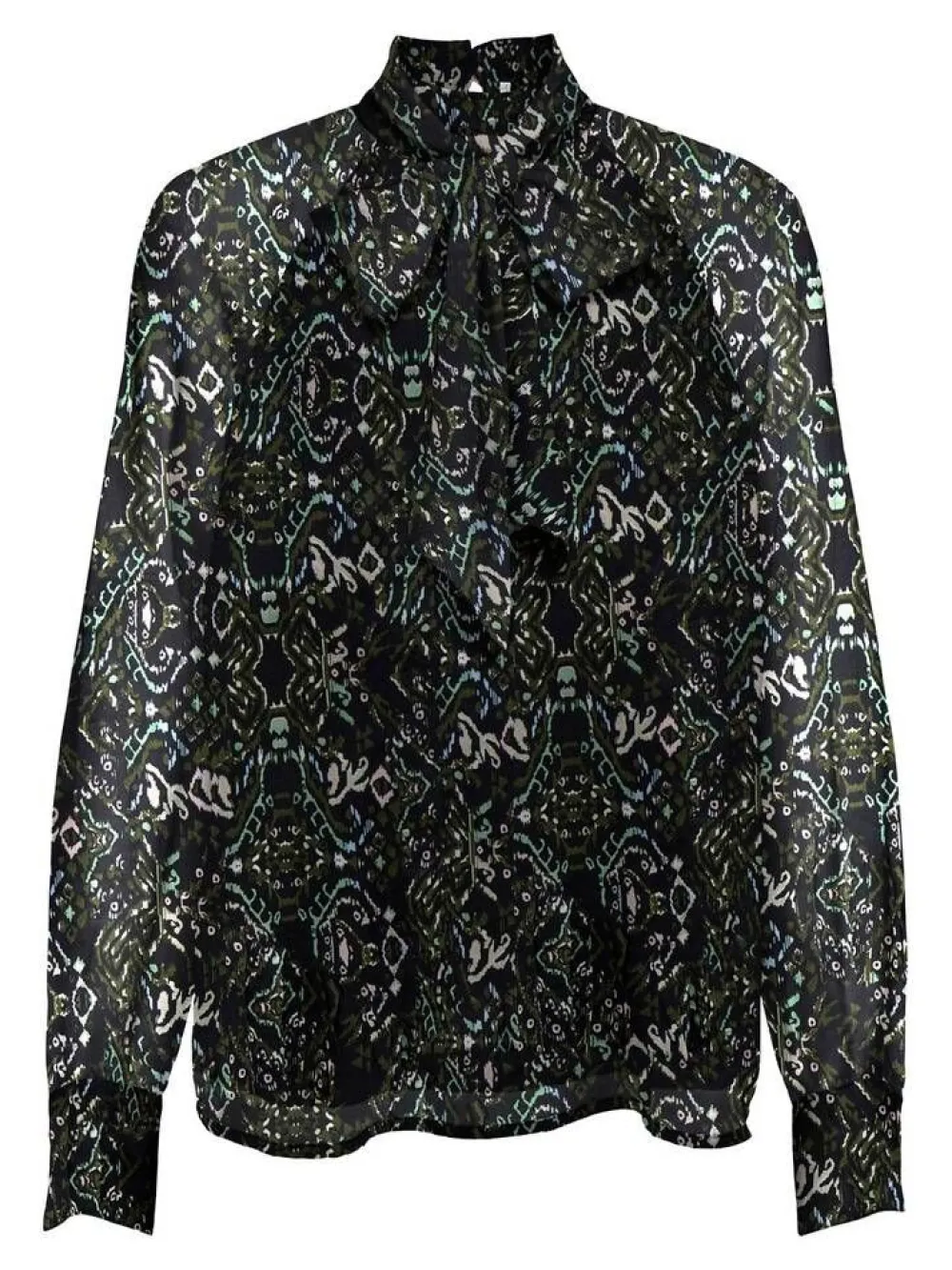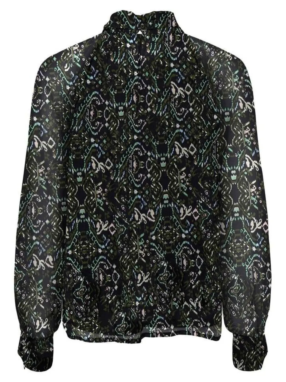 Monivärinen highneck-pusero boho-kuosilla. Kauluksessa on solmittavat nauhat ja pitkät läpikuultavat hihat.Lisää ti…